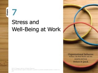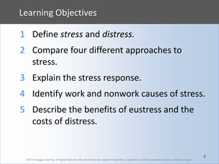 This document discusses stress and well-being at work. It begins with learning objectives about defining stress, comparing approaches to stress, and identifying causes and management of stress. It then defines stress and distinguishes between eustress (good stress) and distress (bad stress). It describes the body's physiological stress response and compares four approaches to understanding stress. It identifies sources of workplace and non-workplace stress and consequences of stress at the individual and organizational levels. It discusses individual differences in stress responses and preventive stress management strategies at primary, secondary and tertiary levels. It covers organizational methods and health promotion programs for managing stress.