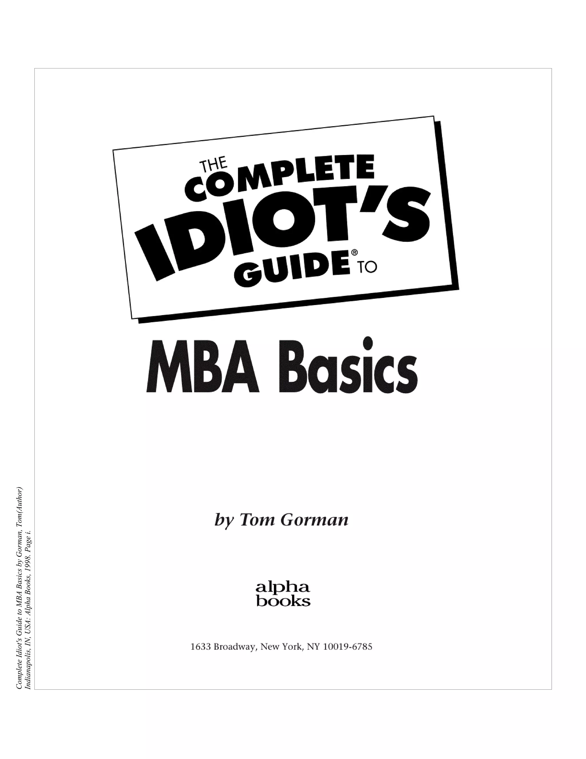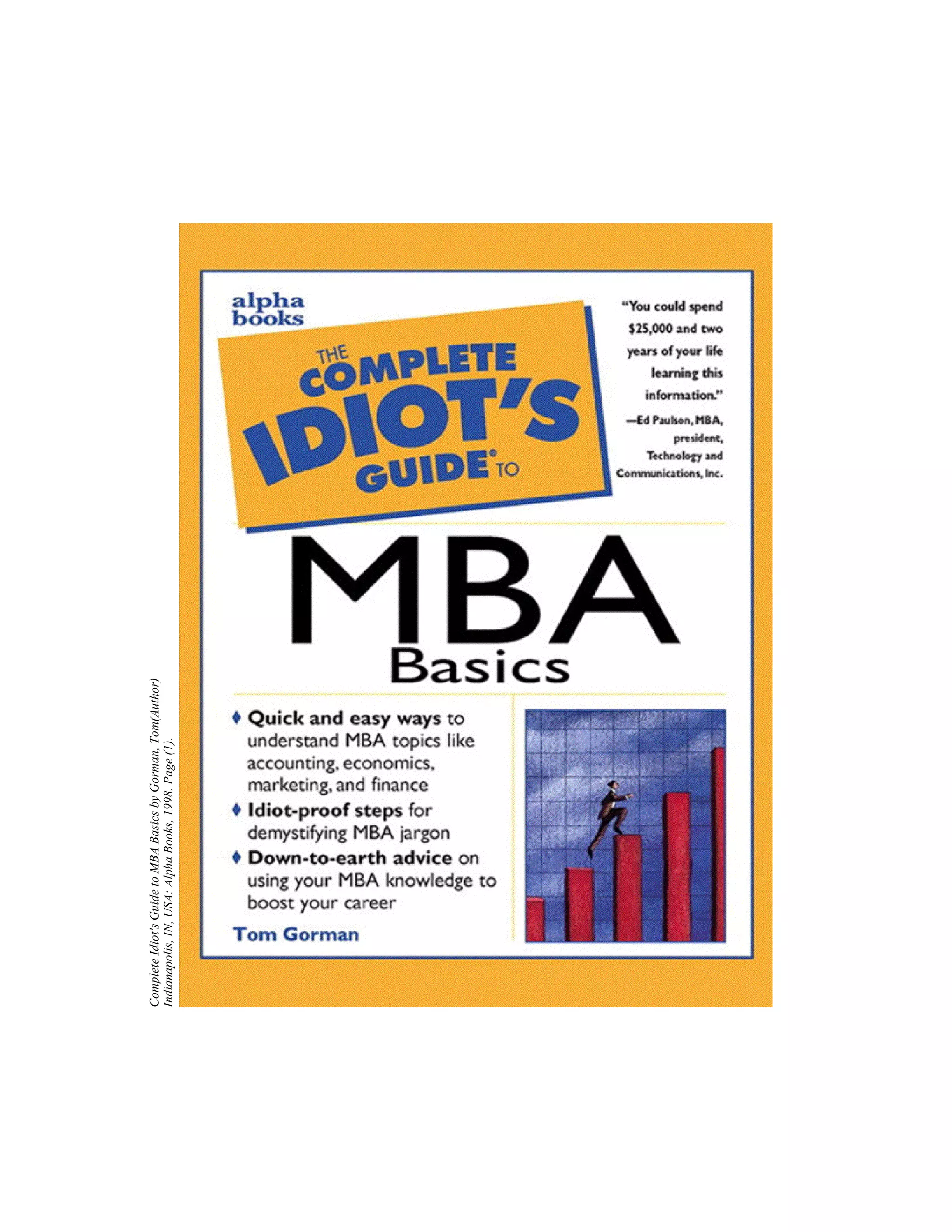 The document consists of citations for pages 1 through 84 of the book "Complete Idiot's Guide to MBA Basics" by Tom Gorman, published in 1998 by Alpha Books in Indianapolis, Indiana. It provides an overview of the table of contents and content across 84 pages but no other contextual details about the book.