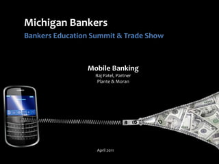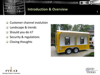This document summarizes a presentation on mobile banking given to Michigan bankers. It discusses the evolution of customer banking channels and the rise of mobile banking. It covers trends like the growing popularity of smartphone apps over SMS/WAP access. The presentation addresses whether banks should adopt mobile banking and considerations like costs, security, and demographic analysis. It provides tips on preventive security measures and discusses relevant regulatory guidance. The closing thoughts encourage banks to offer mobile banking to remain competitive despite implementation costs and security unknowns.