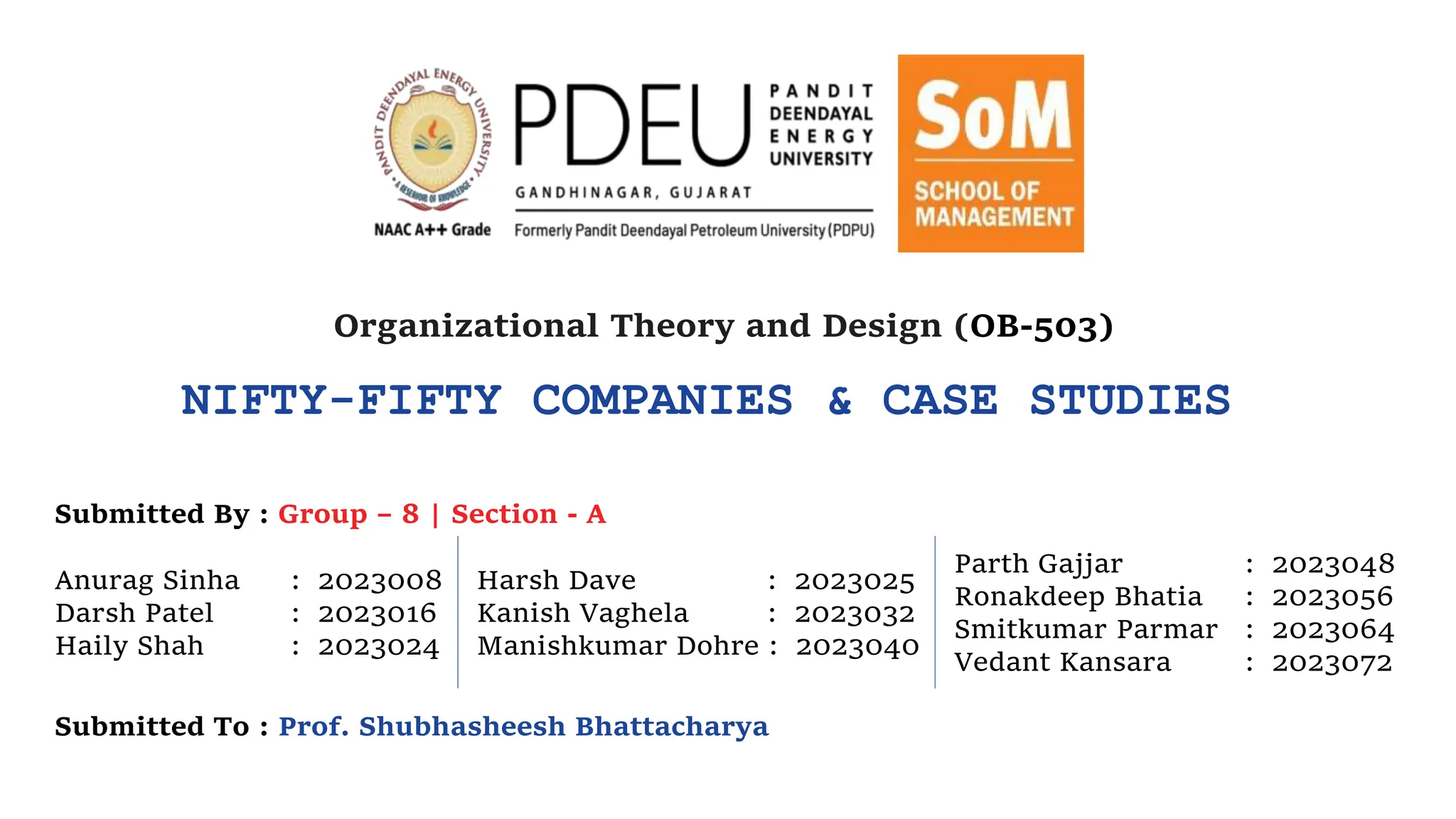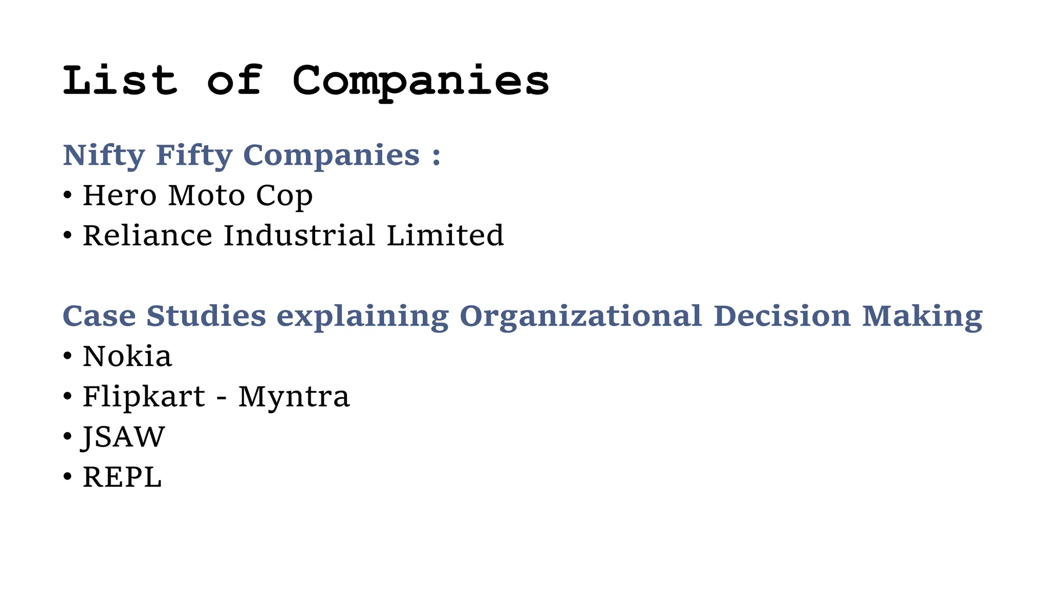 The document presents case studies on Nifty Fifty companies, focusing on their organizational structures, strategies, and challenges. Key companies include Hero MotoCorp, Reliance Industries, Nokia, Flipkart, Myntra, Jindal Saw, and Rajwant Engineering, illustrating various aspects of decision-making, market competition, and ethical dilemmas faced by these firms. Through these examples, the document explores organizational theory in practice, highlighting the importance of adaptability and ethical considerations in business operations.