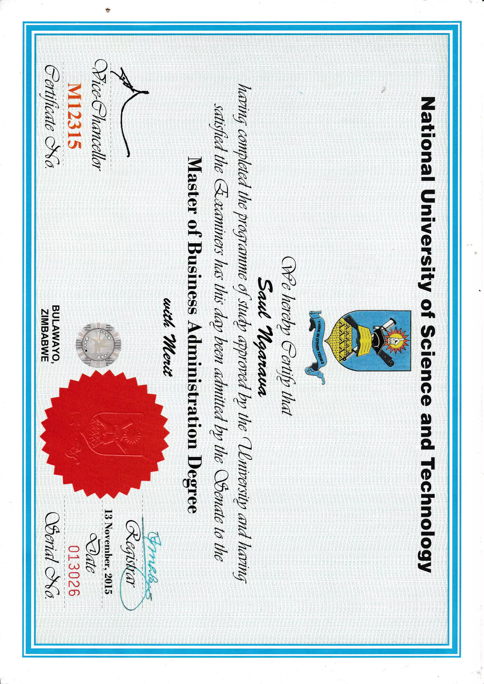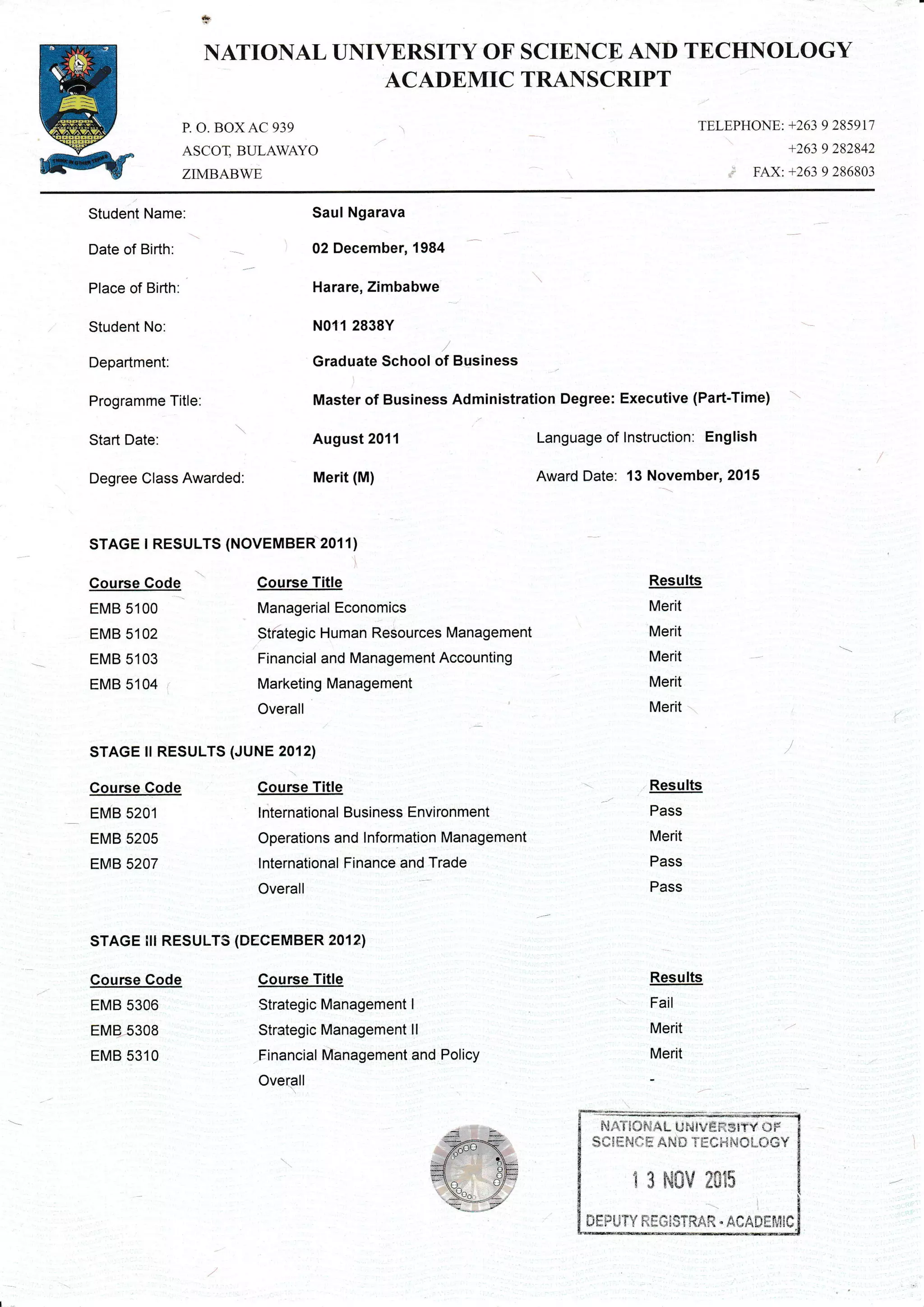 This document is an academic transcript for Saul Ngarava from the National University of Science and Technology in Zimbabwe. It shows that Saul obtained a Master of Business Administration degree in an executive part-time program between August 2011 and January 2015. Over four stages of courses, Saul achieved good results including merits in most courses and a distinction for his dissertation. Saul was awarded his MBA degree on November 13, 2015 with the degree class of Merit.