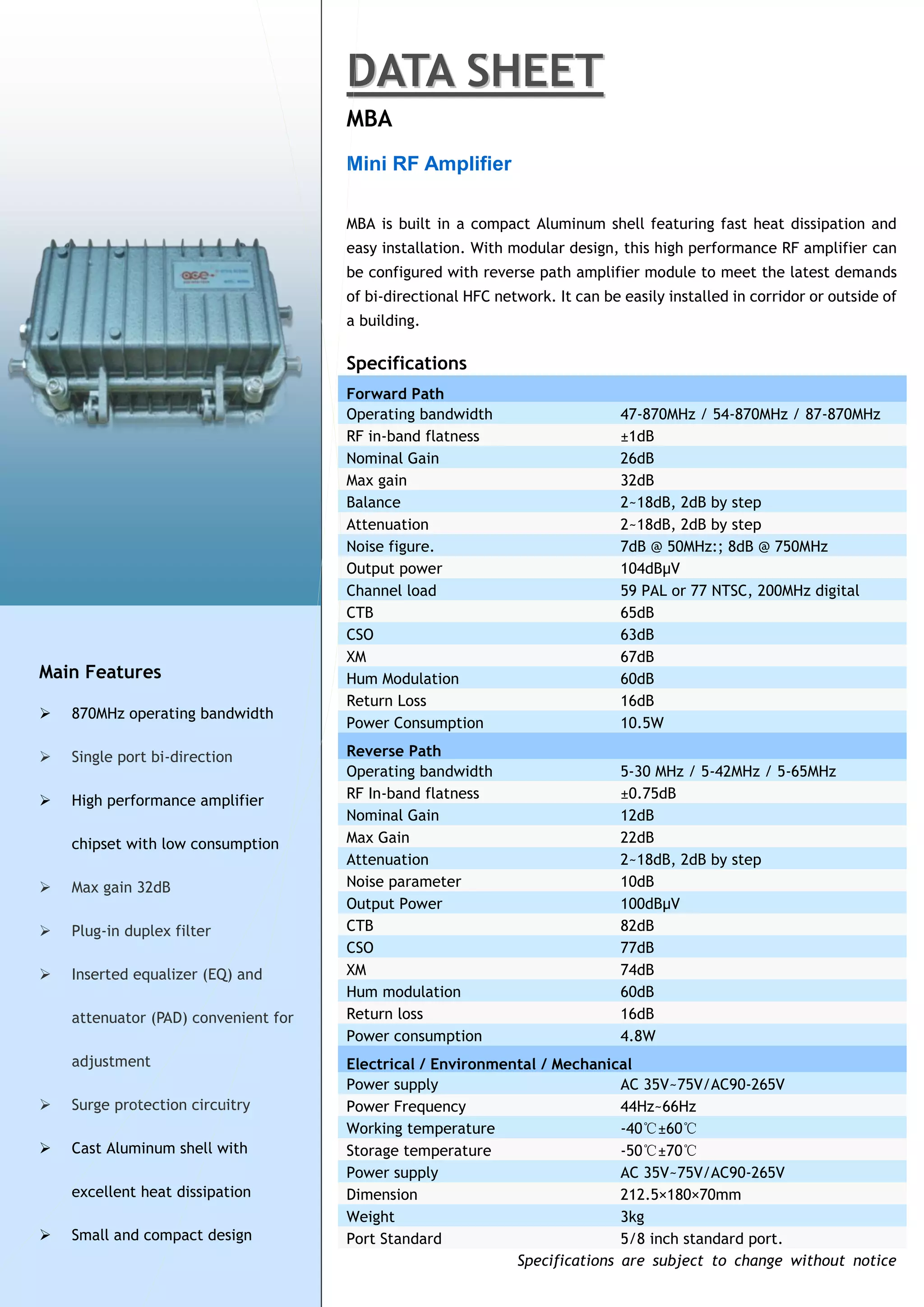 The MBA is a compact RF amplifier built in an aluminum shell for fast heat dissipation. It has a modular design that can be configured with a reverse path amplifier module to meet bi-directional network demands. It operates from 47-870MHz with a maximum gain of 32dB and low noise figure and power consumption. The amplifier can be easily installed in corridors or outside buildings.