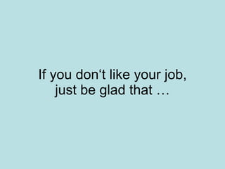 This document compares various jobs that could be considered worse than one's current job and encourages gratitude and getting back to work. It mentions jobs like being an electrician in China, plumber in Hungary, delivery employee in Asia, deodorant tester in Germany, zookeeper in America, horse whisperer in England, and ditch digger in Poland. The worst job mentioned is being a mobile toilet worker. The key message is to appreciate one's job and get back to it instead of complaining.