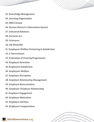 The document lists 50 MBA project topics related to Human Resource Management (HRM), covering various aspects such as work-life balance, employee engagement, training and development, organizational culture, and performance appraisal. These topics aim to explore essential HRM functions and their effectiveness within organizations. The list serves as a resource for students seeking project ideas in the field of HRM.