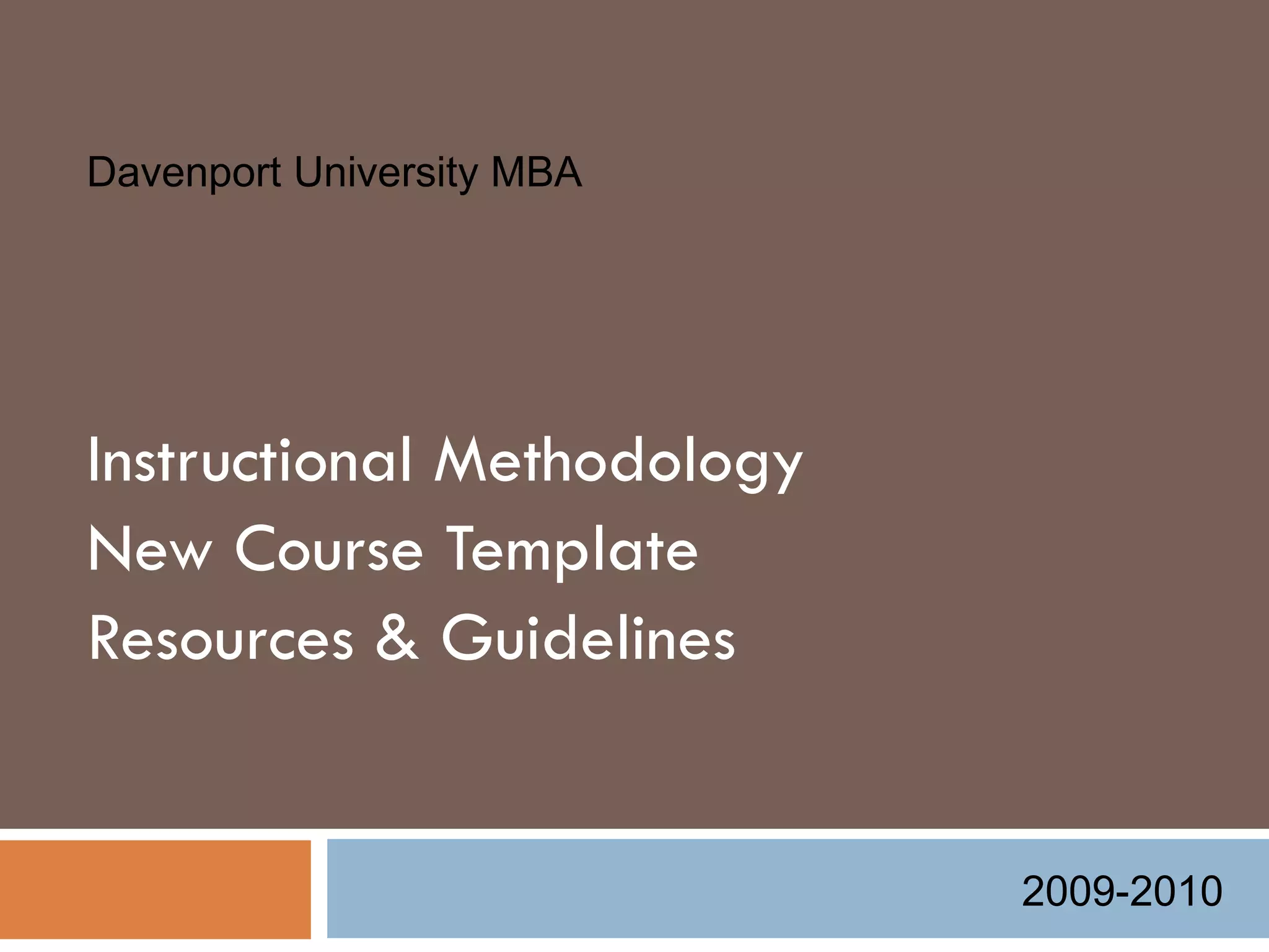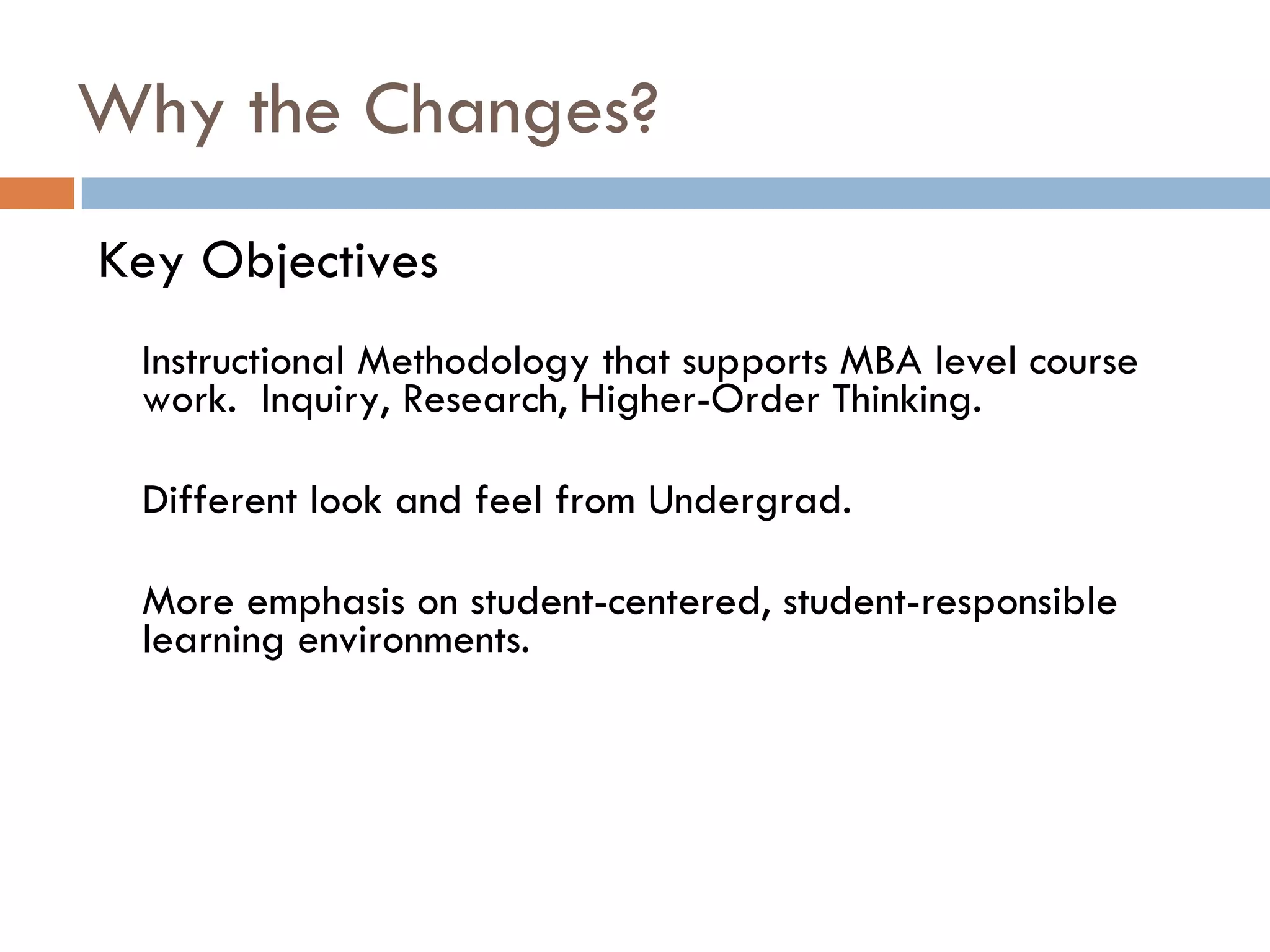 The document discusses changes to the instructional methodology for Davenport University's MBA program. The changes aim to shift from an assignment-based approach to a topic-based learning forum model to encourage more student-centered, inquiry-driven learning. Under the new model, forums will account for 40% of grades and focus on research, analysis and peer interaction around broader topics. Reflection will also be a required 10% component to support the learning process. Guidelines are provided for setting up the learning forums and assignments to reflect the new distribution of points and ensure a consistent template across courses.
