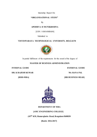 This document provides an introduction and overview of an internship report on an organisational study conducted at LG Electronics PVT LTD. It includes declarations, acknowledgements, contents, and an executive summary. The internship lasted 4 weeks with the objectives of gaining business insights and understanding how the different departments function within the organization. The report examines LG's marketing strategies, procurement practices, and McKinsey's 7S framework as applied to the company. It also provides a SWOT analysis and discusses the learning experience.