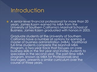 James Kasim earned his MBA from the University of Southern California's Marshall School of Business in 2003, graduating with honors. The Marshall School offers several MBA programs, including a traditional full-time two-year program, a part-time program over three years, and a Global Executive MBA program in partnership with a Chinese university. All programs focus on teaching global business skills.