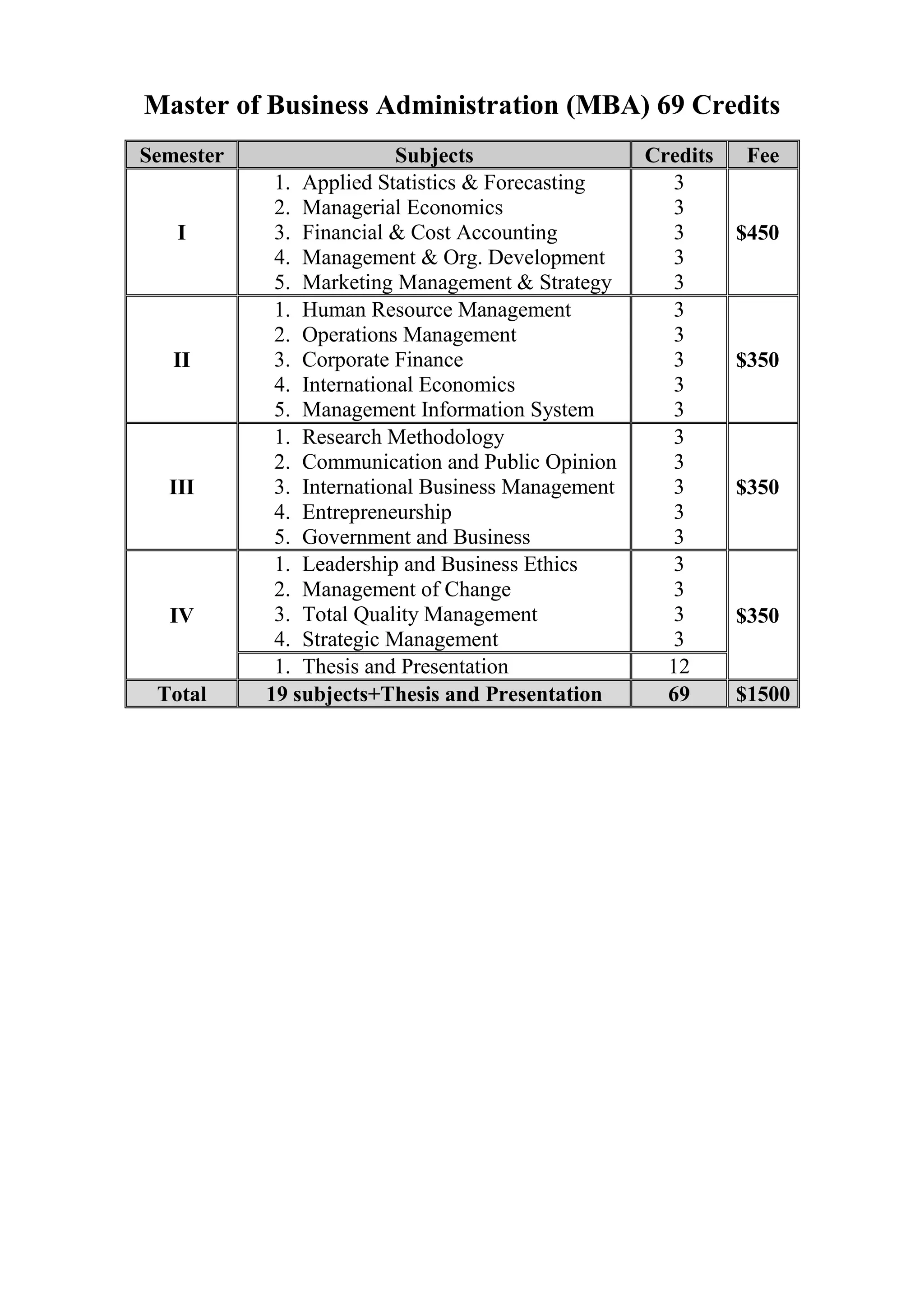 The MBA program requires completion of 69 credits over 4 semesters. Students take 19 subjects across various business disciplines like statistics, accounting, finance, marketing, operations, and human resources. They also complete a 12-credit thesis and presentation. The program costs $1500 in total with fees of $450, $350, $350, and $350 due each semester.