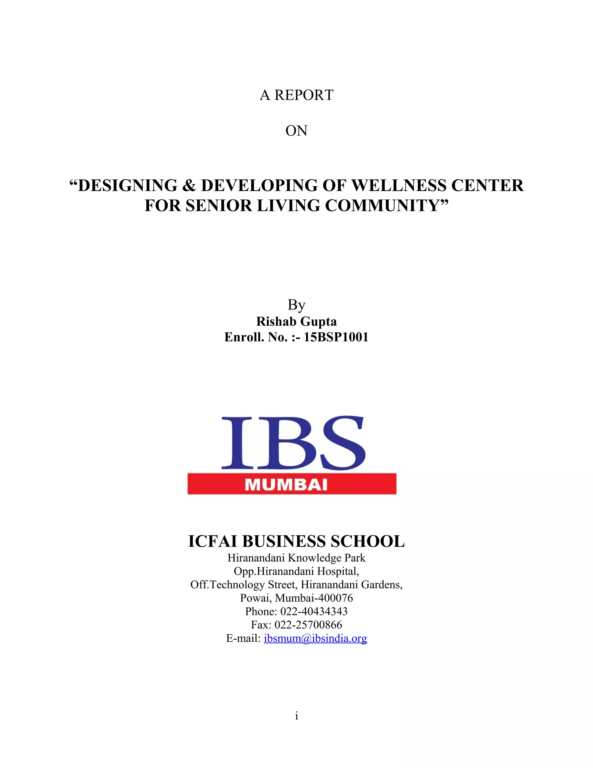 The document is a report on designing and developing a wellness center for a senior living community. It discusses the need for wellness centers given the growing senior population in India. It outlines the key activities, facilities, and advantages of wellness centers. These include physical, emotional, social and cognitive activities that promote healthy aging. The report also provides an analysis of the senior living industry in India through a SWOT analysis and discusses the market potential and marketing strategies for wellness centers.