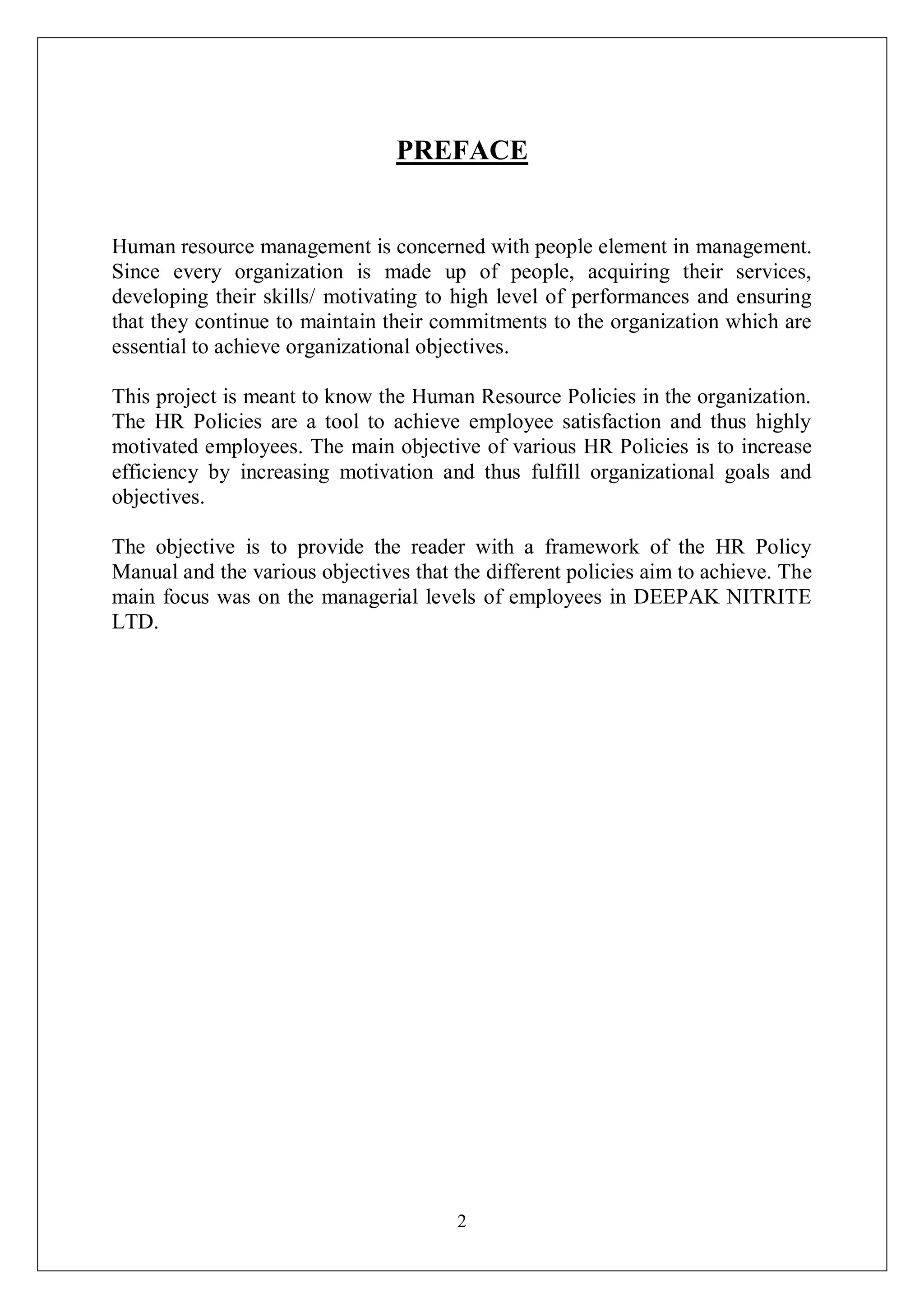 This document provides a project report on the HR policies and their implementation at Deepak Nitrite Limited. It begins with an introduction to the topic and objectives of studying the company's HR policies. It then discusses the research methodology used involving data collection, sampling and hypotheses. The main body of the report analyzes the key HR policies at Deepak Nitrite Ltd and presents data analysis and interpretations. It concludes with suggestions and recommendations. The company is described as a leading manufacturer of organic, inorganic, fine and specialty chemicals with five manufacturing facilities in India and a focus on quality, innovation and customer satisfaction.