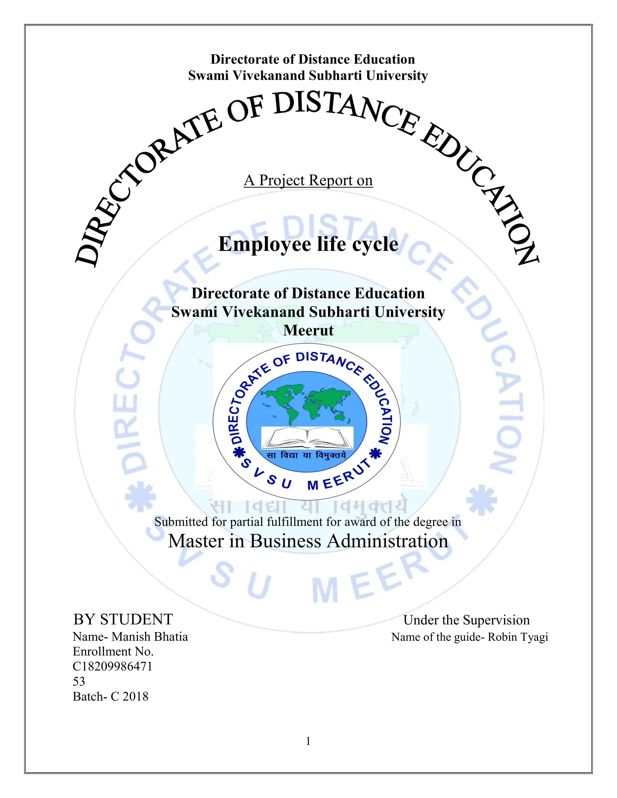 The project report submitted by Manish Bhatia at Swami Vivekanand Subharti University focuses on the employee life cycle within Superior Energy Services, detailing aspects such as talent acquisition, training, and performance evaluation. It aims to analyze employee satisfaction related to their lifecycle and recommend measures for improvement. The project represents original research under the guidance of Robin Tyagi and fulfills the MBA degree requirements.