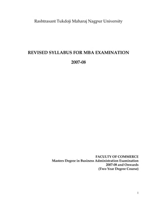 The document outlines the revised syllabus for the MBA examination from 2007-2008 onwards at Rashtrasant Tukdoji Maharaj Nagpur University. It details the scheme of examination including duration of the course, eligibility criteria, examination fees, subjects covered in each semester, grading system, specializations offered, and guidelines for conducting internal examinations and project work. The MBA is a 2-year program with 4 semesters, covering subjects related to business management, research, specializations, and a final project. Exams for semesters 1,3 are conducted internally while 2,4 are university exams. Students must meet minimum marks criteria to be promoted to subsequent semesters.
