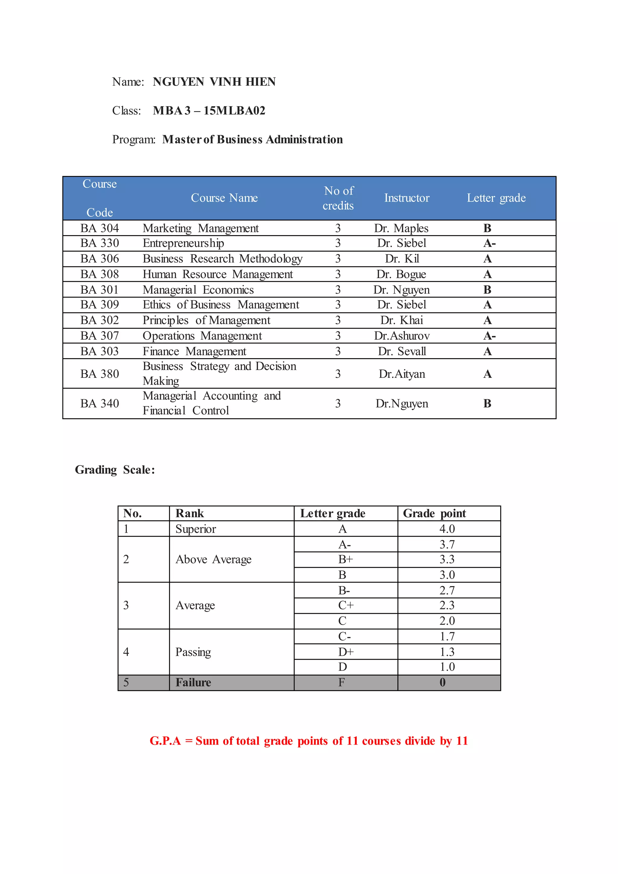 This document contains information about a student named Nguyen Vinh Hien in the MBA program at a university. It lists the 11 courses he took, the credits for each course, the instructor, his letter grade, and the grading scale. It notes that his GPA is calculated by summing the total grade points from the 11 courses and dividing by 11.
