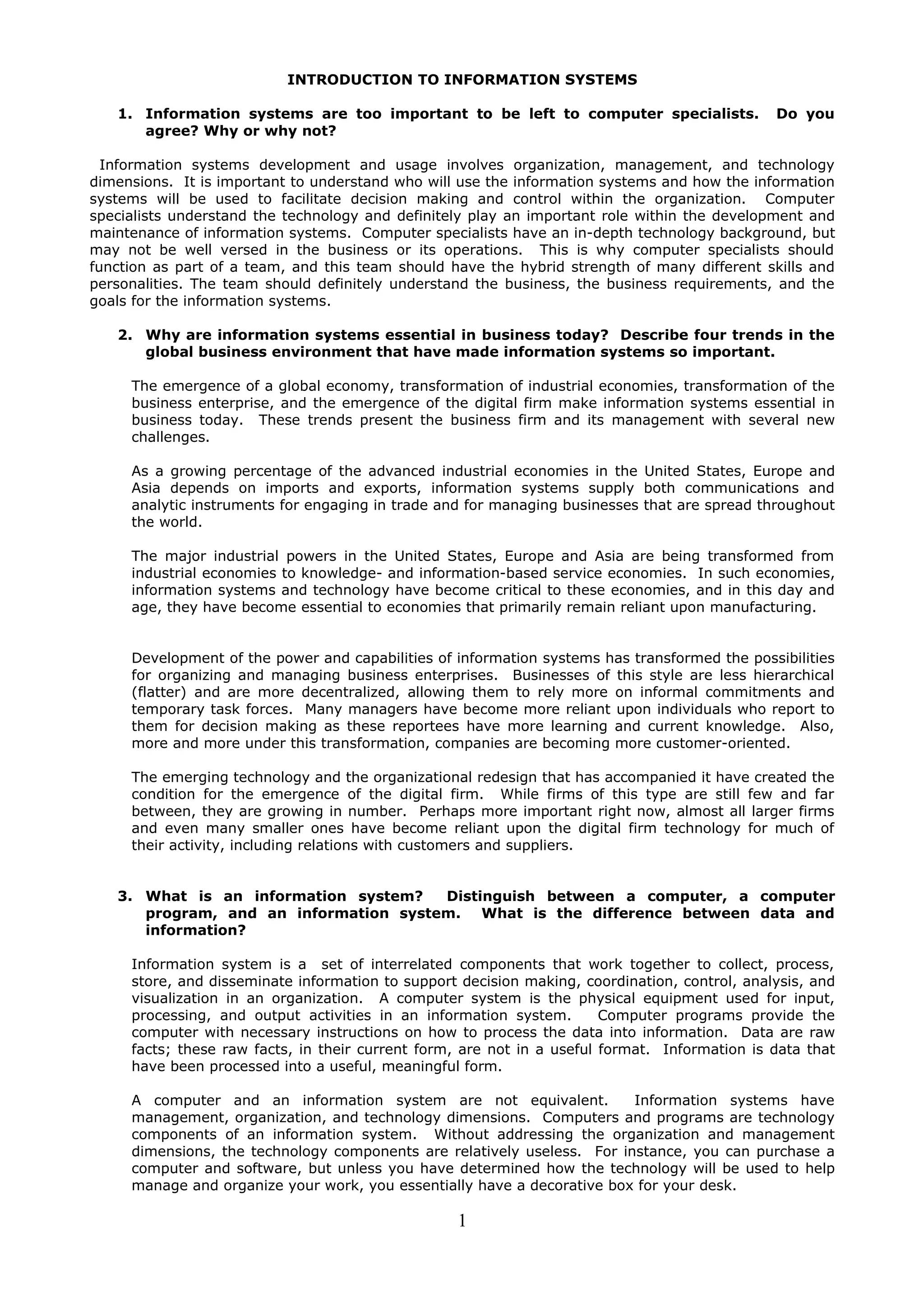 Information systems involve organizational, management, and technology dimensions. Computer specialists understand technology but may lack business knowledge, so they should work as part of an interdisciplinary team. Information systems are essential in business today due to trends like globalization, the rise of knowledge economies, the transformation of business models, and the emergence of digital firms. An information system includes interrelated components for collecting, processing, storing, and sharing information to support decision making. It differs from a computer or program, which are technological components of an information system. Data becomes useful information after being processed into meaningful form.