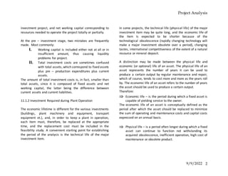This document discusses project financing and financial analysis. It provides details on determining total investment costs, which include initial investment costs like land, buildings, equipment, and working capital. Production costs are also broken down, including factory costs, overhead, depreciation, and financing costs. Financial ratios are discussed to facilitate analysis, comparison of projects, and determine financial risk. The net present value and internal rate of return are introduced as metrics to evaluate project viability.