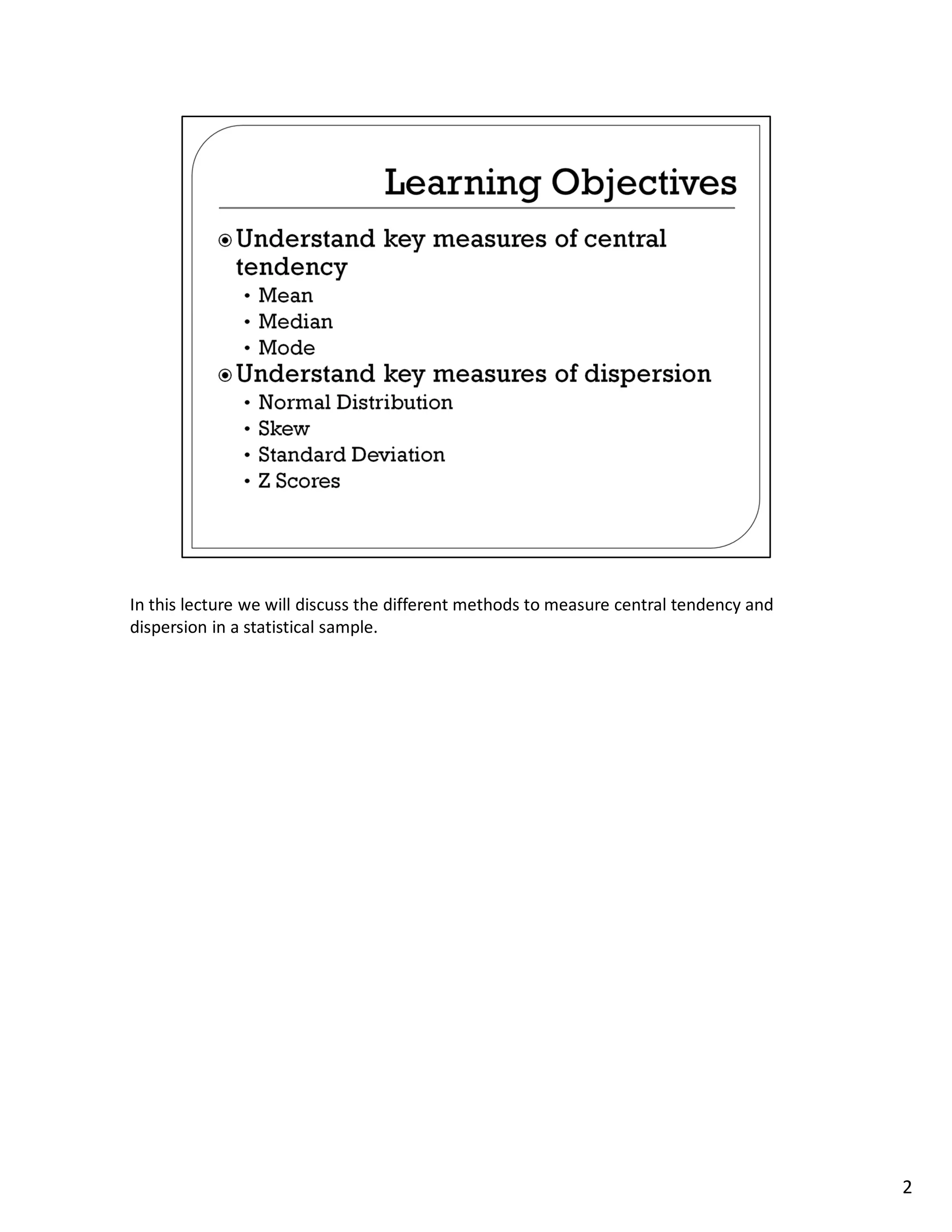 This lecture discusses methods for measuring central tendency and dispersion in statistical samples. Central tendency refers to the most typical or common value in a sample, such as the average or median. Measures of central tendency include the mean, median, and mode. Dispersion describes how spread out or varied the values in a sample are and is measured by the standard deviation. The lecture explains these concepts and provides examples to illustrate how measures of central tendency and dispersion can be used to analyze and understand sample data distributions.