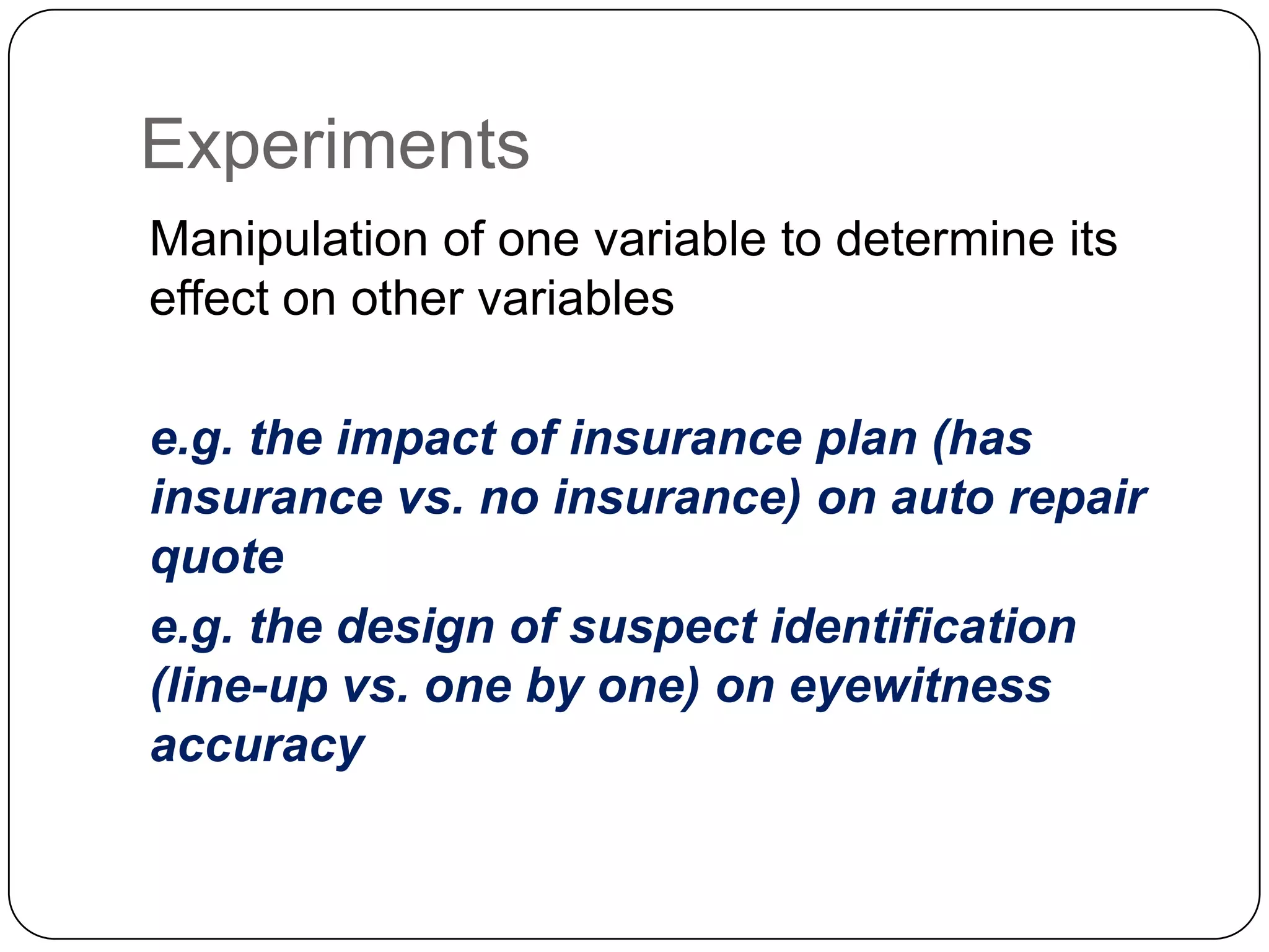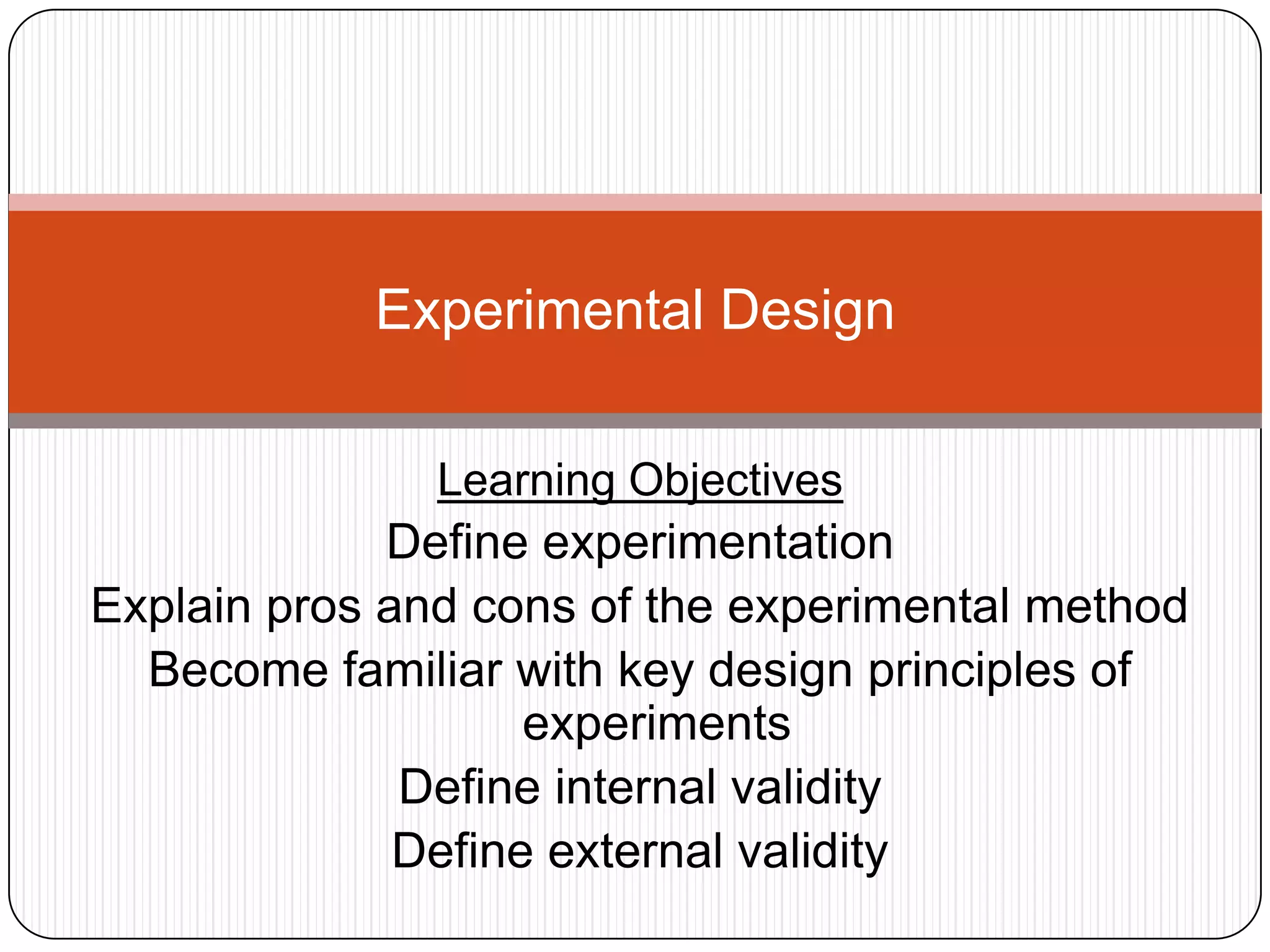 This document defines key concepts in experimental design including experiments, causation versus correlation, control groups, random assignment, internal and external validity, and the pros and cons of experimental methods. It explains that experiments manipulate independent variables to determine their effect on dependent variables and discusses strategies for establishing evidence of causality, such as time order of events and ruling out other possible causes. The document also covers how much control researchers have in different types of studies from observations to full experiments and notes important considerations for conducting experiments like specifying treatment variables, levels, and designs and ensuring validity.