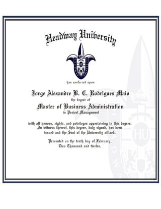 Jorge Alexandre B. C. Rodrigues Maio was awarded a Master of Business Administration degree in Project Management with all honors from the University. The University issued the degree, which was duly signed, on February 10, 2012 to commemorate receiving his Master's degree in Project Management.