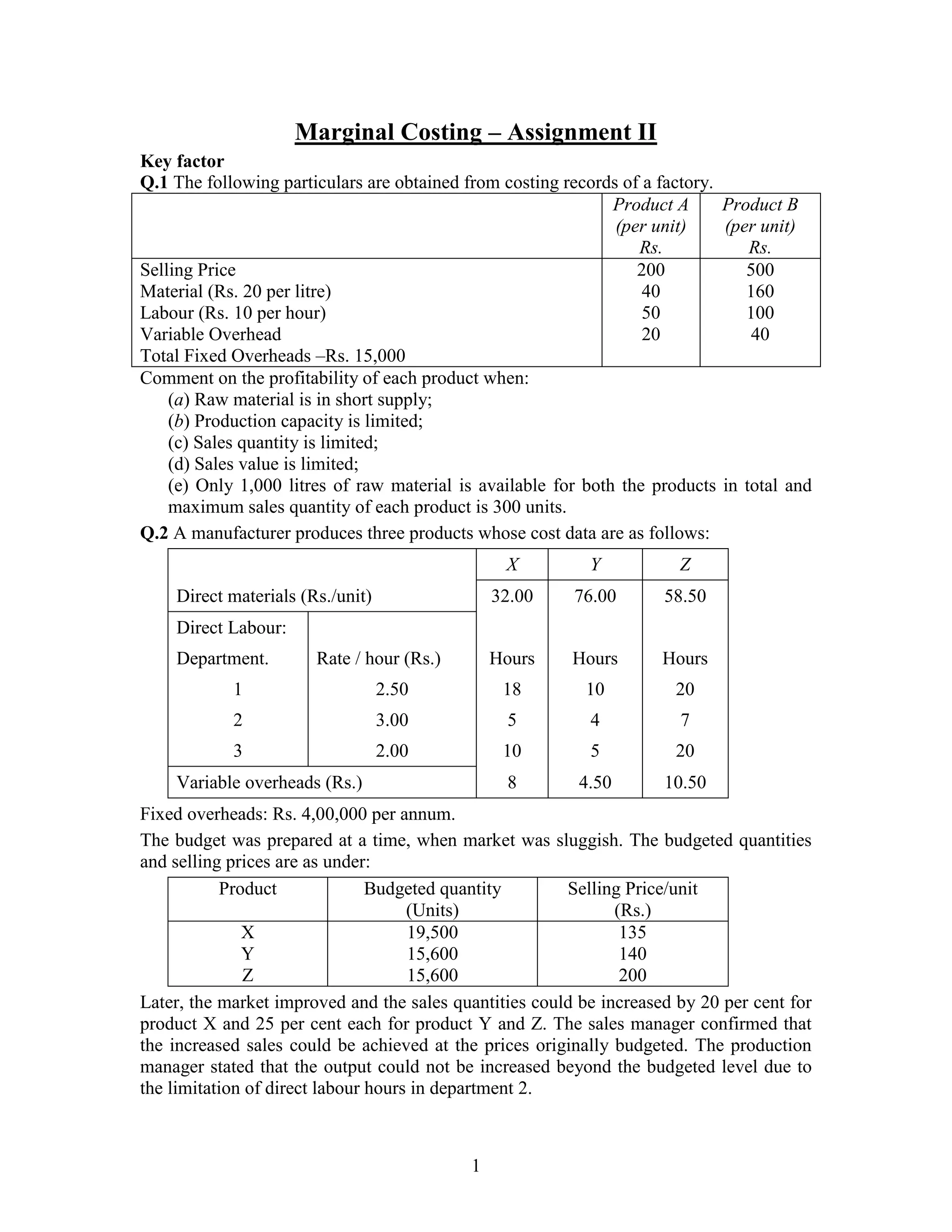 The document contains information about costs and revenues for multiple products/orders. It includes questions about determining profitability given constraints on materials, production capacity, sales quantity or value. It also includes questions about determining optimal product mix, budgeted profitability, determining selling prices, and whether special orders should be accepted. Cost information like materials, labor, overheads, fixed and variable costs are provided for analysis using techniques like marginal costing.