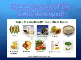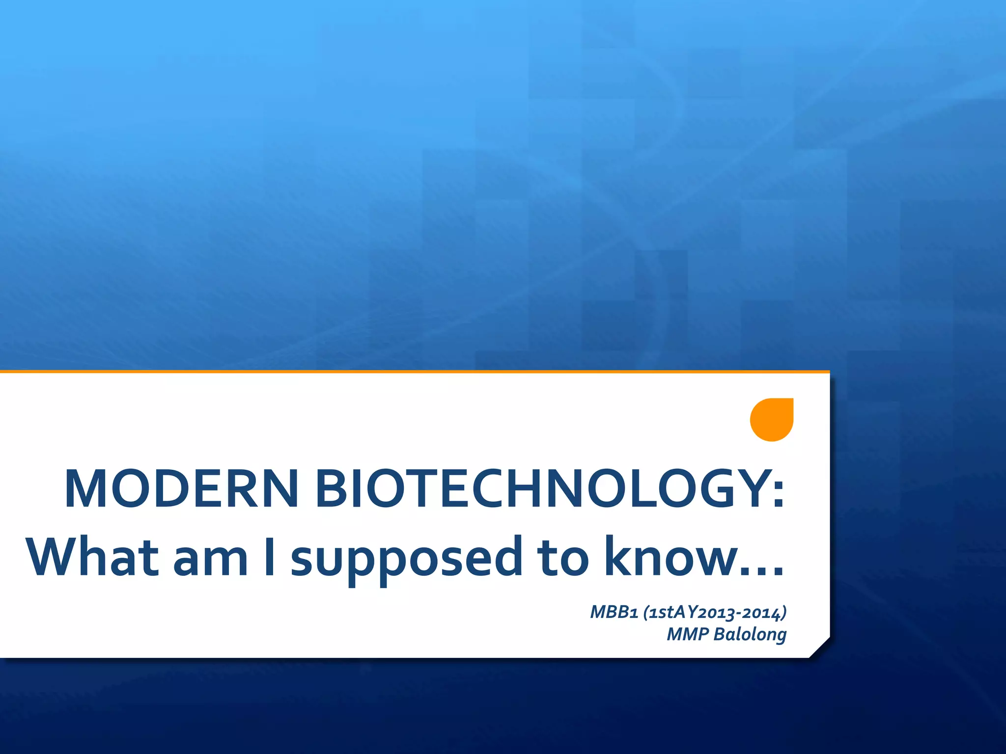 The document outlines the content of a lecture on modern biotechnology. It discusses DNA as the genetic material and how genes are passed from parents to offspring in prokaryotic and eukaryotic systems. It also describes how modern biotechnology uses techniques like gene cloning and genetic engineering to develop genetically modified organisms (GMOs) by inserting foreign genes. Specific examples covered include the development of Golden Rice to address vitamin A deficiency and the use of GMOs in health, industry, food, and the environment.