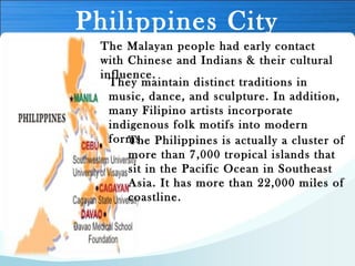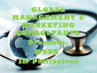 The document presents an overview of pursuing an MBBS degree in the Philippines, highlighting the country's distinct cultural influences and its status as a major English-speaking nation. It outlines the advantages of studying there, including international-standard education, economical living costs, and eligibility criteria for students. The document also provides details about recognized universities and additional information for admissions and contact for prospective students.