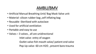1. AMBU/BMV bags which are used for artificial ventilation and come in reusable silicone bags of 250ml or 500ml size.