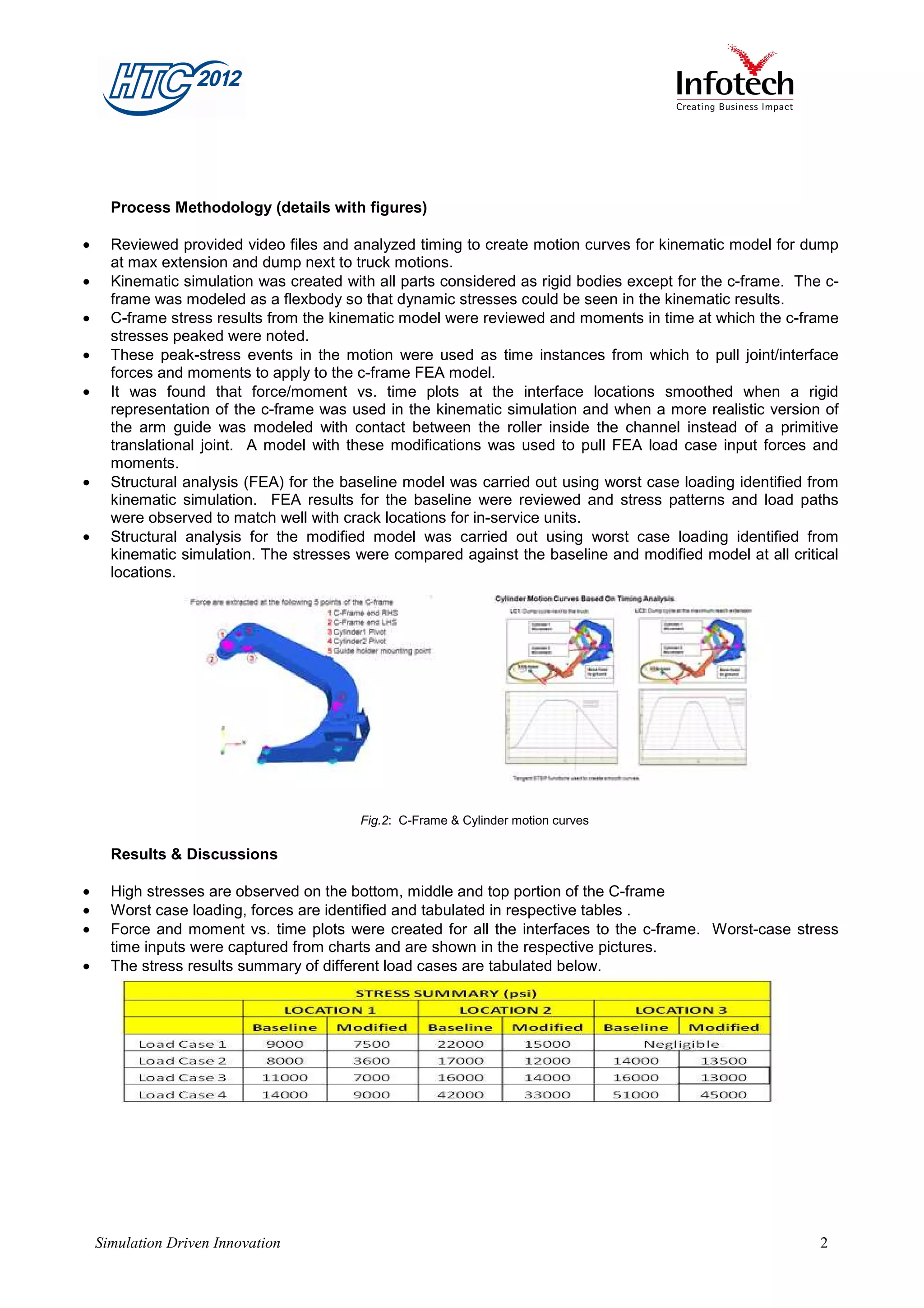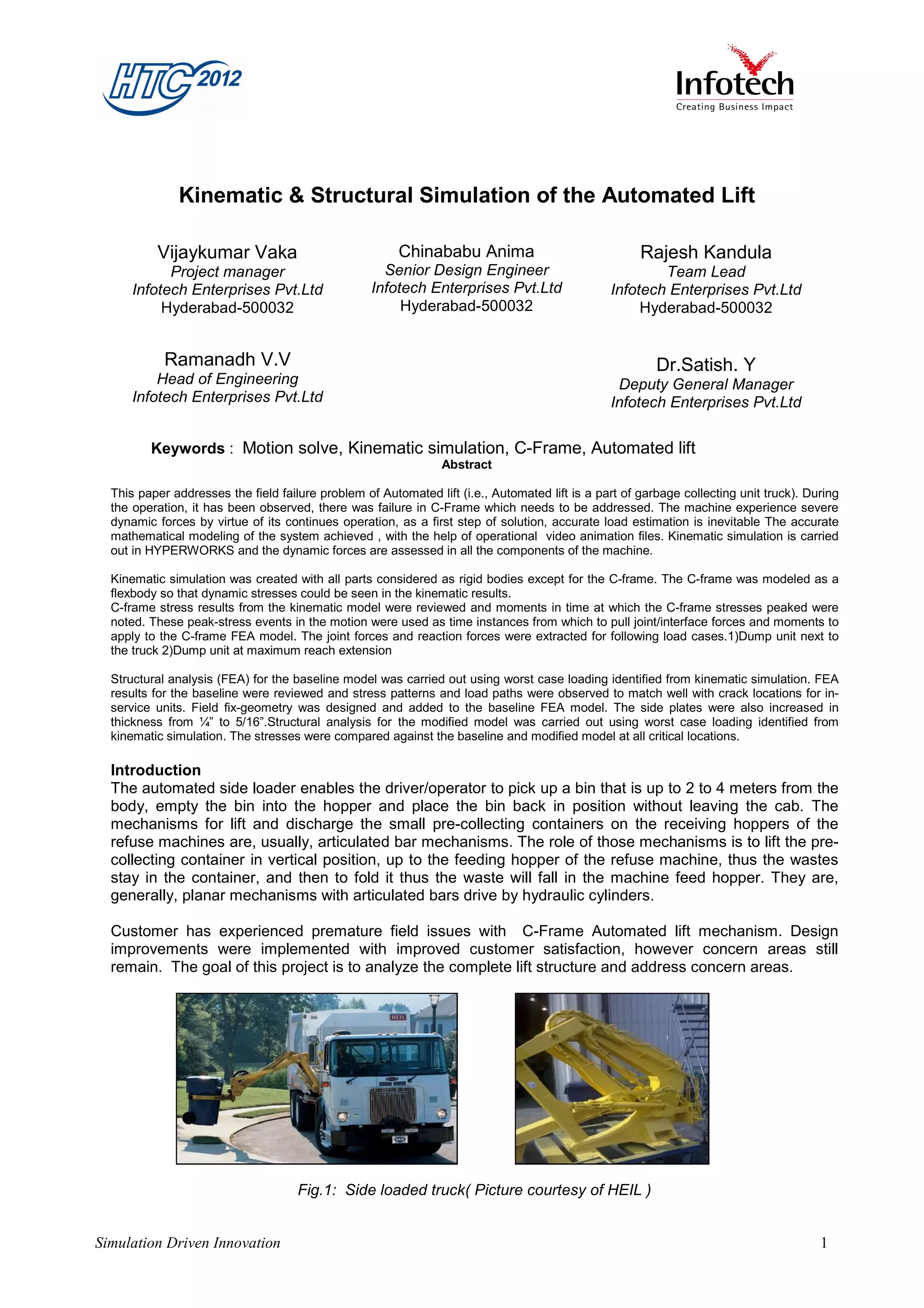 This document discusses the kinematic and structural simulation of an automated lift used in garbage collection trucks. The simulation aimed to address field failures of the lift's C-frame. Kinematic simulation identified worst case loading scenarios. Structural analysis of the baseline model matched stress patterns to known crack locations. A modified model with increased plate thickness showed reduced stresses. The accurate modeling and simulation helped validate an improved field fix design and reduce stresses by 15-35% compared to the baseline.