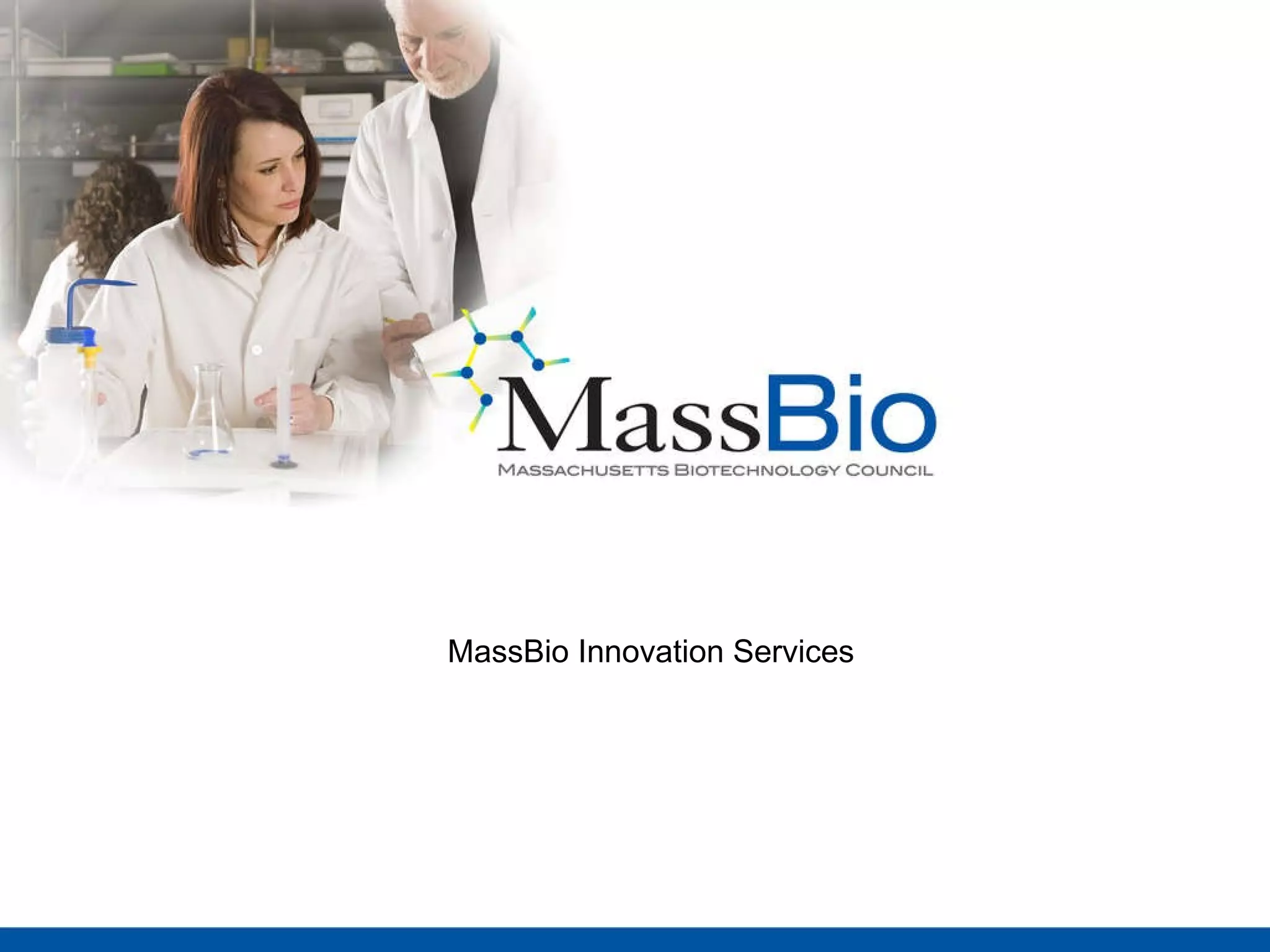 The document summarizes services offered by MassBio Innovation Services to help pharmaceutical and biotech companies access innovative technologies and opportunities for partnership. Key services include MassCONNECT for mentoring emerging companies, MassBio Innovation Exchange for accessing intellectual property, Pharma Days for focused partnering meetings, the Investor Forum conference, and Innovators' Roundtables for industry discussions. Subscription fees are listed for each service to support the programs.