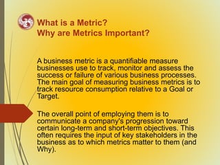 This document discusses management by metrics (MBM) and provides guidance on developing and using metrics to track business performance. It defines what a metric is and explains that the goal of metrics is to measure performance relative to goals and objectives. It then provides a five-step process for developing appropriate metrics and discusses common business metrics such as sales revenue, customer retention, costs, margins, and productivity. The document emphasizes linking metrics to objectives and identifying the key drivers and processes that impact performance. Finally, it outlines a three-step leadership roadmap for managing with metrics that involves defining objectives, integrating the customer perspective, and identifying performance drivers and processes.
