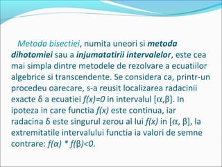 Metoda bisection este o tehnică de rezolvare a ecuațiilor algebrice și transcendente care implică localizarea unei rădăcini exacte într-un interval dat. Aceasta se bazează pe principiul că, pentru o funcție continuă cu semne opuse la extremitățile intervalului, există cel puțin o rădăcină între acestea. Algoritmul implică împărțirea repetată a intervalului și ajustarea extremităților în funcție de semnul produsului funcției la punctele medii, până când intervalul devine suficient de mic pentru a oferi o aproximație dorită.