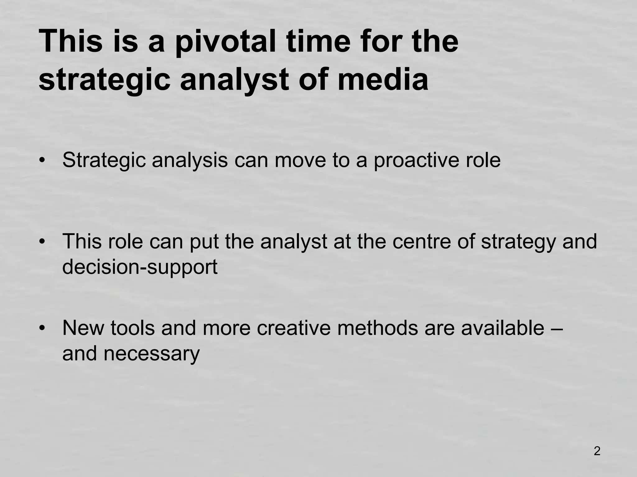 The seminar by Mark Linder discusses the evolving role of strategic media analysts who must embrace a proactive approach to understand the changing landscape of media influence. Emphasizing the importance of broader analysis beyond traditional media outlets, it explores topics like social media dynamics, influence mapping, and the necessity for real-time tracking of trends and public sentiment. The document highlights that effective strategic analysis now requires integrating various media types and understanding the intricate dynamics of public discourse.