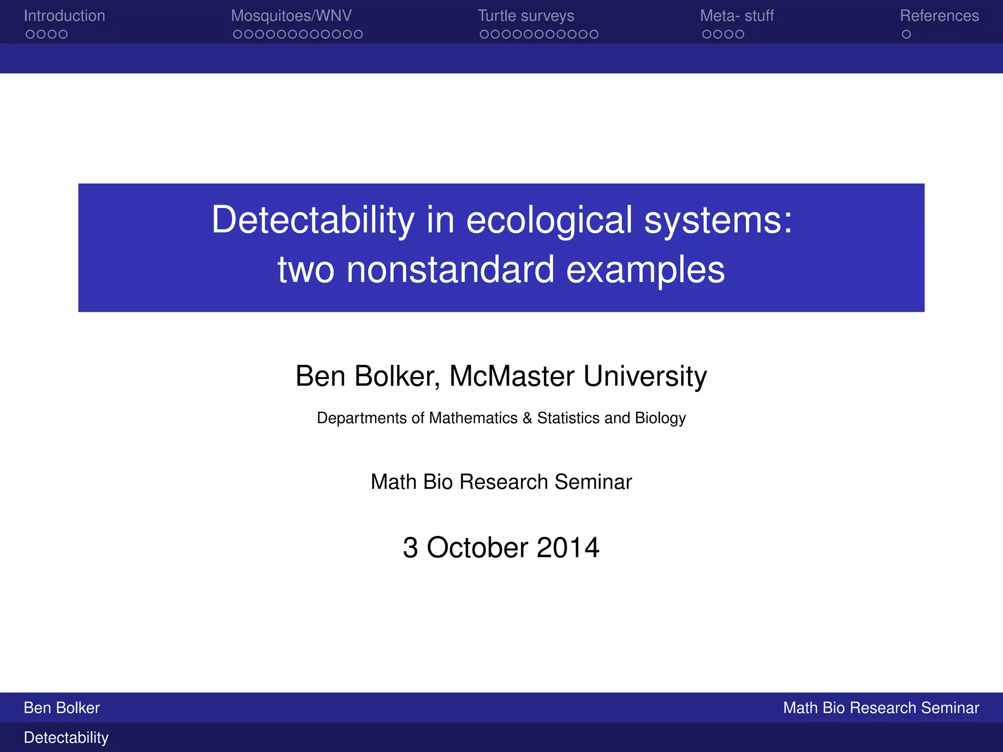 This document summarizes a seminar on detectability in ecological systems. It discusses using genetic data from mosquito blood meals to estimate the population size of American robins, presenting mathematical frameworks including maximum likelihood estimation and Good-Turing estimators. It also briefly outlines using turtle recapture data to estimate their population size. The seminar covers challenges in estimating population sizes when detectability is imperfect and individuals vary in their likelihood of being detected.