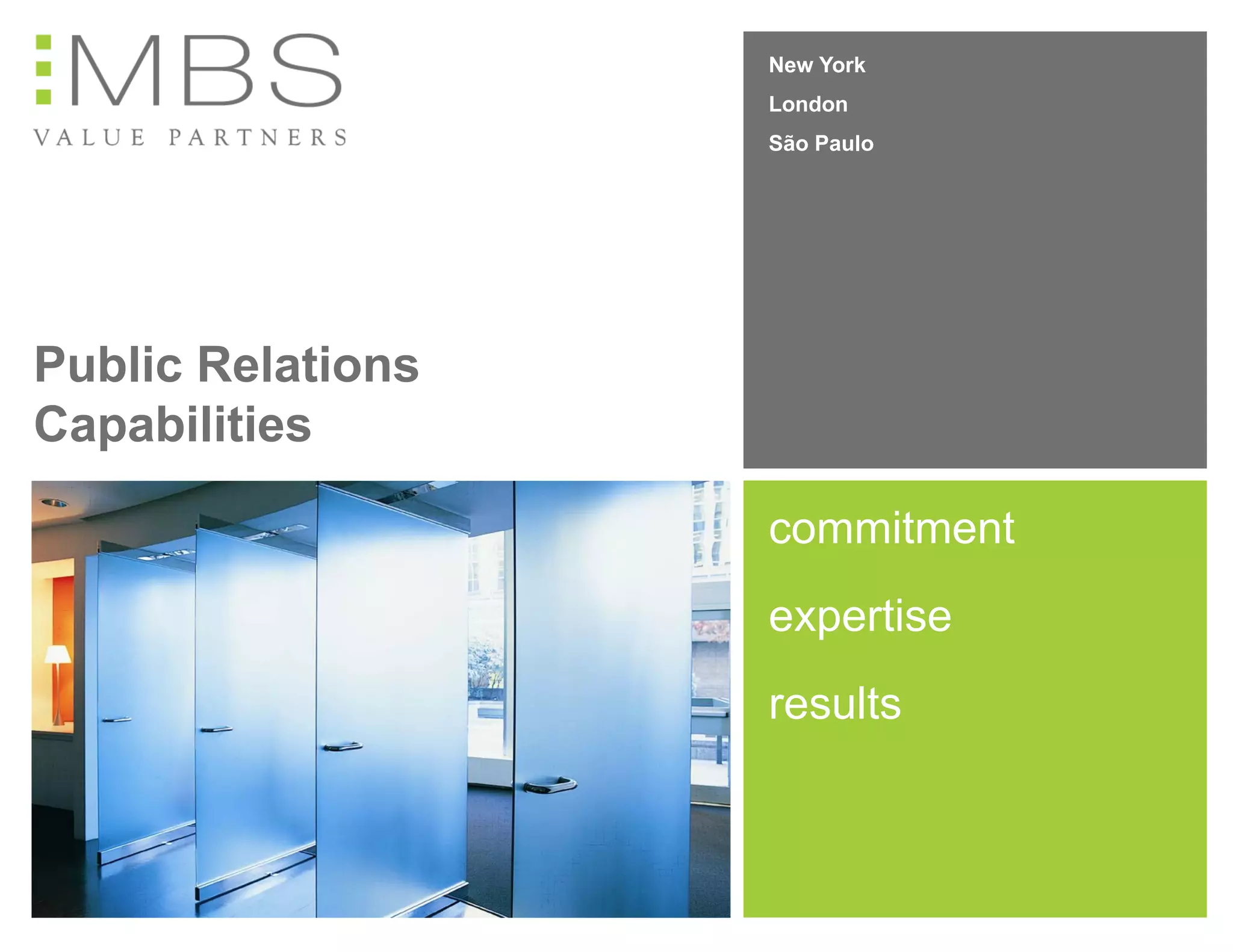 MBS provides public relations and communications services focused on building corporate brands and positioning companies through strategic communications plans, media outreach, and leveraging traditional and social media channels. Their services include corporate communications, transactions, crisis communications, social media, and executive training. The company works with clients across various industries and has experience in North America, Europe, and emerging markets.