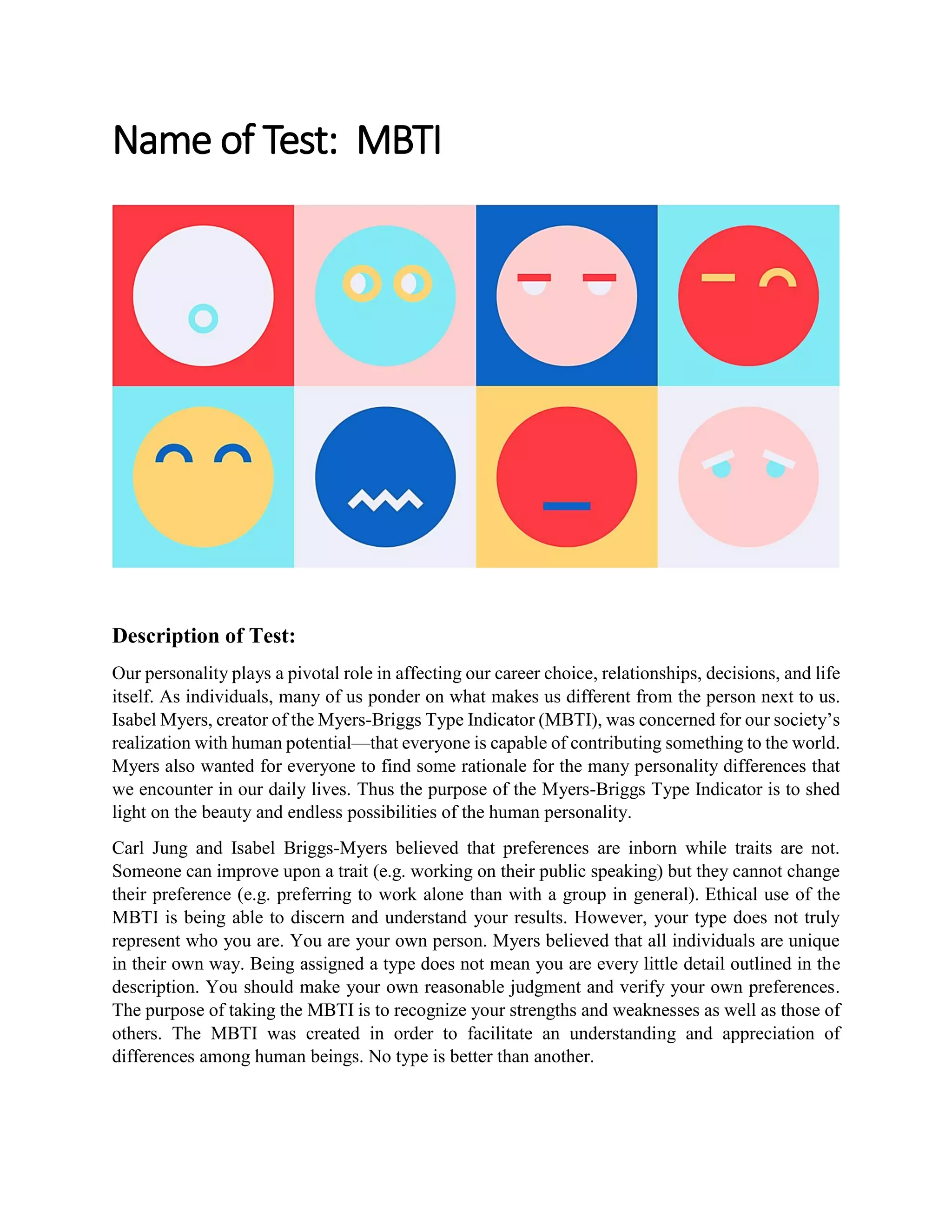The document provides an overview of the Myers-Briggs Type Indicator (MBTI) personality test. It describes how Isabel Briggs Myers and Katharine Cook Briggs developed the test based on Carl Jung's work to help people better understand their personality types and differences. The MBTI uses four dichotomies - extraversion/introversion, sensing/intuition, thinking/feeling, judging/perceiving - to assign one of 16 personality types. It aims to help individuals recognize their strengths and weaknesses and appreciate differences in others.