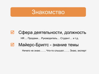 Документ посвящен типологии Майерс-Бриггс (MBTI), описывающей различные психологические типы личности и способы их определения. Он включает информацию о четырех основных аспектах: экстраверсия/интроверсия, сенсорика/интуиция, мышление/чувство и суждение/восприятие. Типология помогает лучше понять себя и других, что может быть полезно в личной жизни, работе и общественных отношениях.