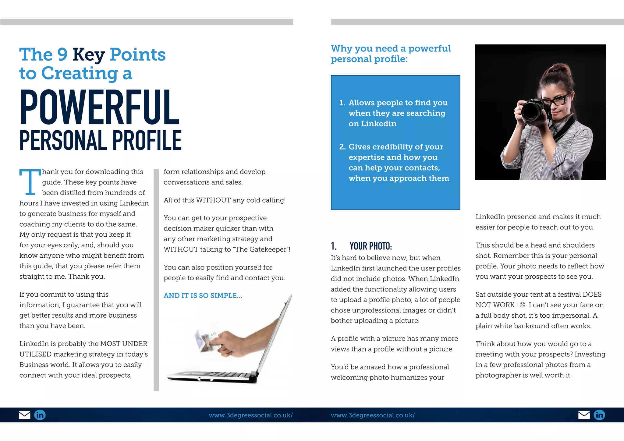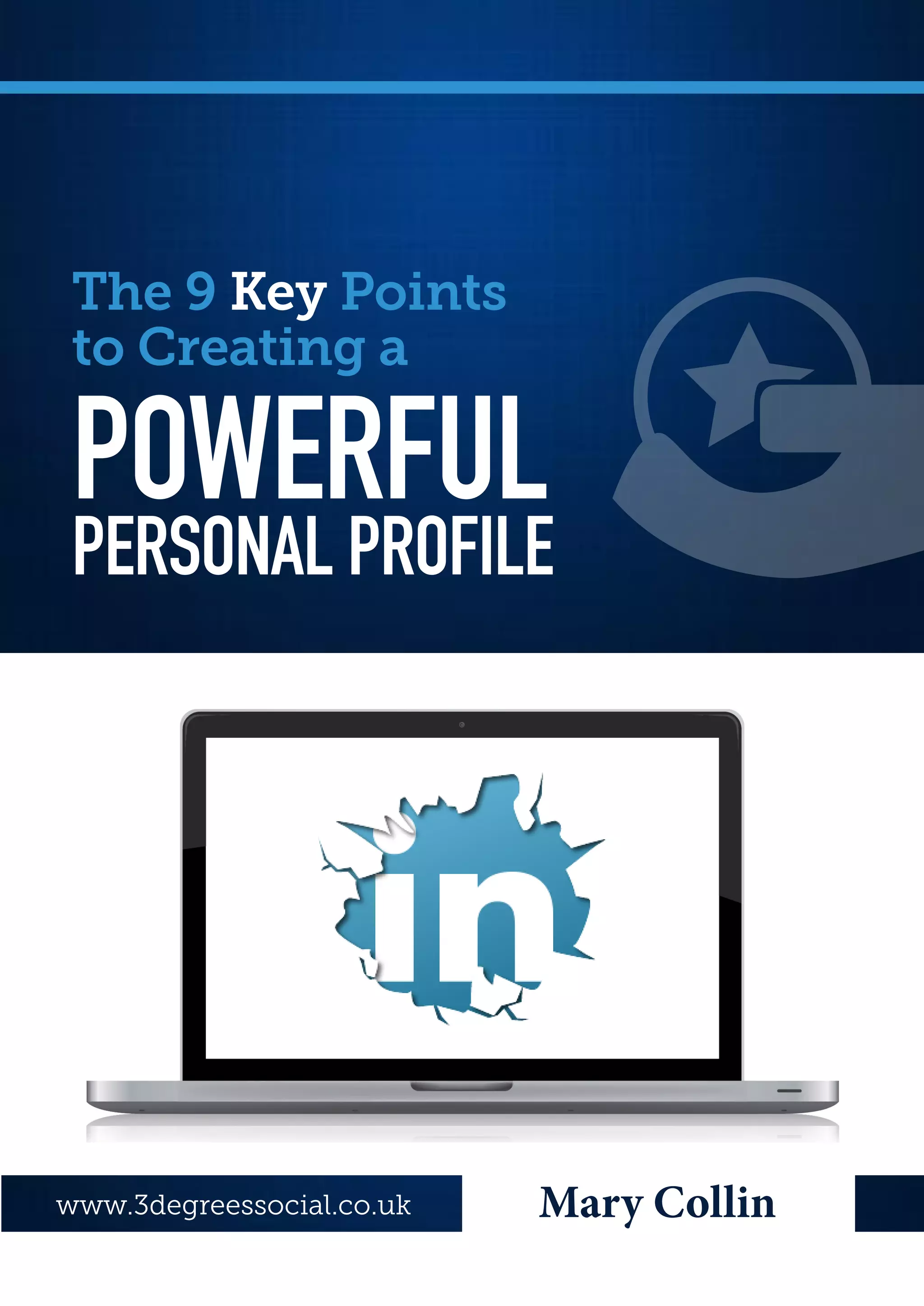 The document outlines 9 key points for creating a powerful personal profile on LinkedIn to generate business. It discusses the importance of including a professional photo, using your name as you want to be addressed, and crafting an attention-grabbing headline that focuses on the value provided to clients. The summary should highlight expertise and how you can help contacts, and include search terms. Recommendations from clients are also important to include.
