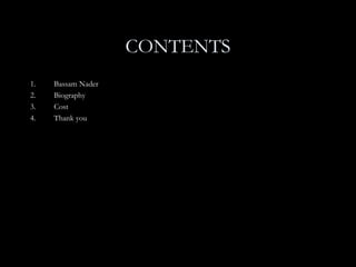 Bassam Nader is a Lebanese MC and public speaker with over 12 years of experience hosting various events in the UAE and Lebanon. His biography lists over 150 events that he has hosted, ranging from corporate events and product launches to weddings and charity events. The document provides his contact information and qualifications for hiring him to host events. It emphasizes his ability to entertain audiences and ensure they feel engaged. The cost section is left blank, indicating one would need to inquire separately about pricing.