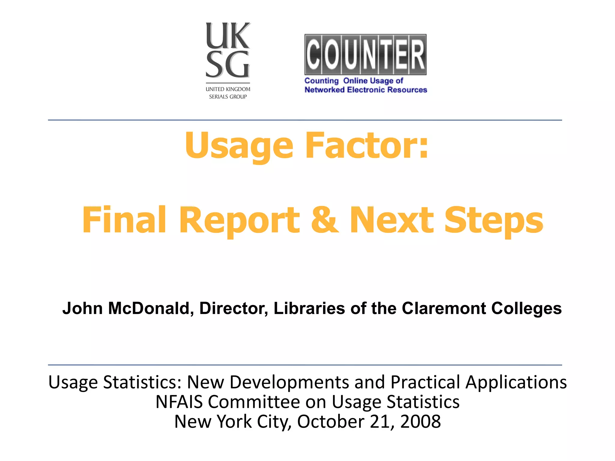 1. The document discusses developing a Usage Factor (UF) metric to measure the usage and value of journals, similar to the Impact Factor.