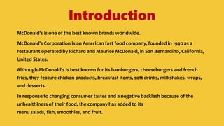 McDonald's is one of the world's most well-known fast food brands. It uses an integrated marketing communications approach including advertising, sales promotions, public relations, and direct marketing. McDonald's promotes brand awareness and positive associations through campaigns like "You deserve a break today" and "I'm Lovin' it". It also uses contests on social media to engage youth. McDonald's franchise model and supply chain help ensure consistent quality and taste globally while allowing for local menu customization based on customer preferences. The brand focuses on delivering sales in the short-term while protecting its long-term reputation through menu innovations and appealing to different target segments like children, youth, and families.