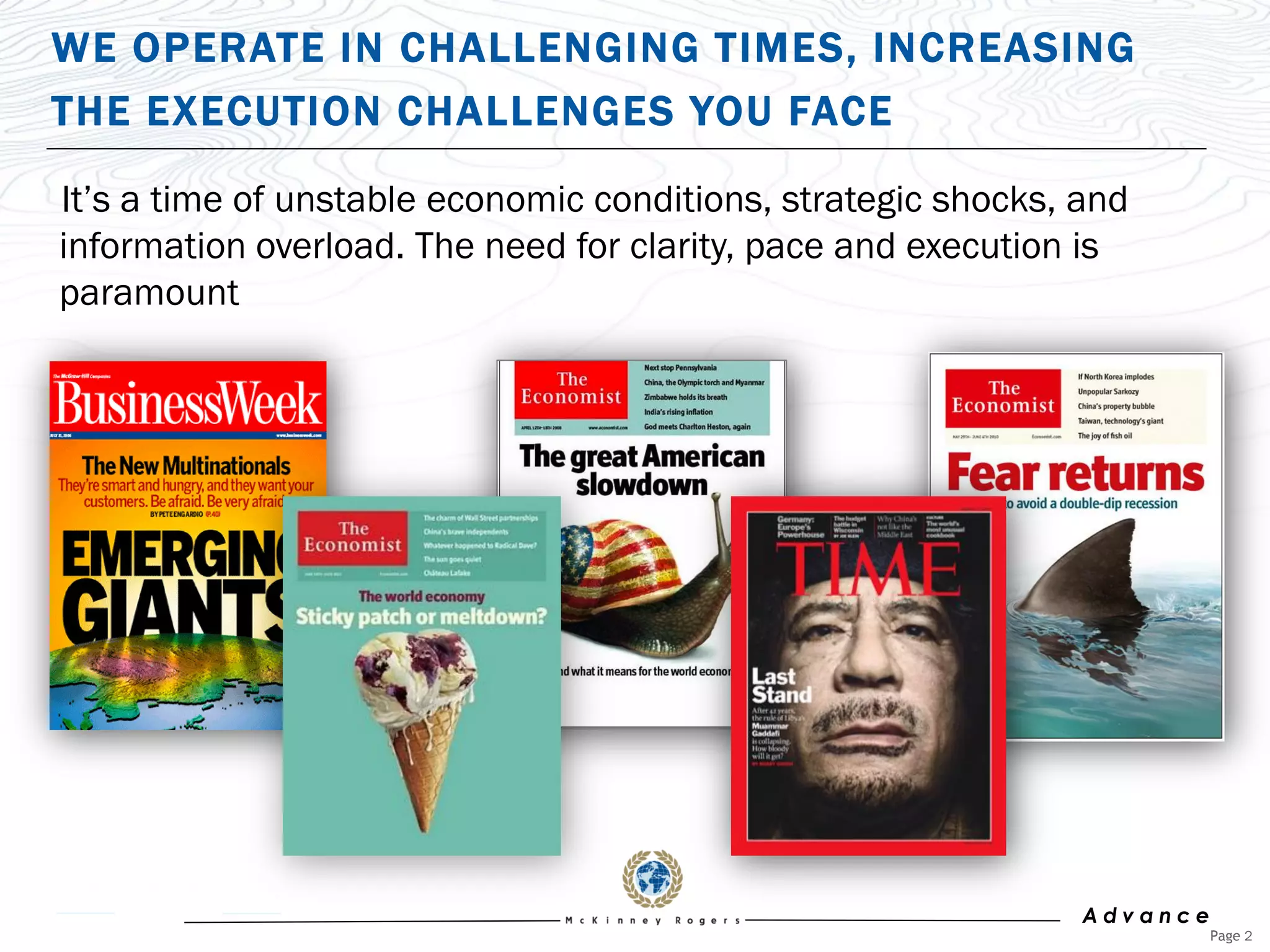 The document discusses McKinney Rogers and their approach to business execution. They focus on equipping leaders and teams to achieve extraordinary results regardless of obstacles. Their unique model includes mission planning, analysis, rehearsal, dashboards, high performance teams, leadership development, and competitive intelligence. Their philosophy of "Mission Leadership" is based on proven military disciplines and has been applied successfully with clients across industries globally.