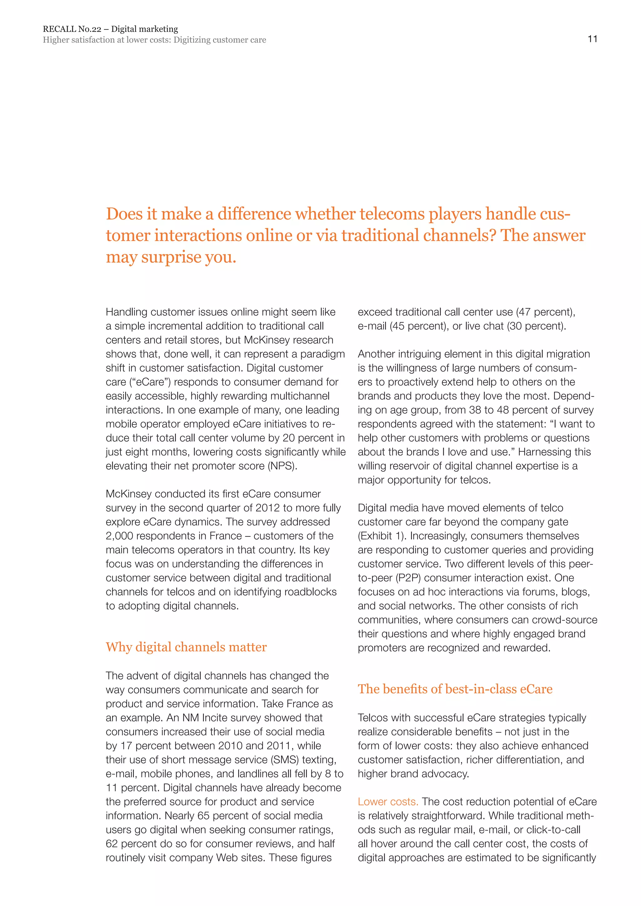 Digitizing customer care through effective digital customer care (eCare) initiatives can significantly improve customer satisfaction while lowering costs for telecom companies.