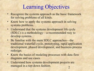 - The systems development life cycle (SDLC) applies this approach to developing information systems and includes phases like planning, analysis, design, and implementation.