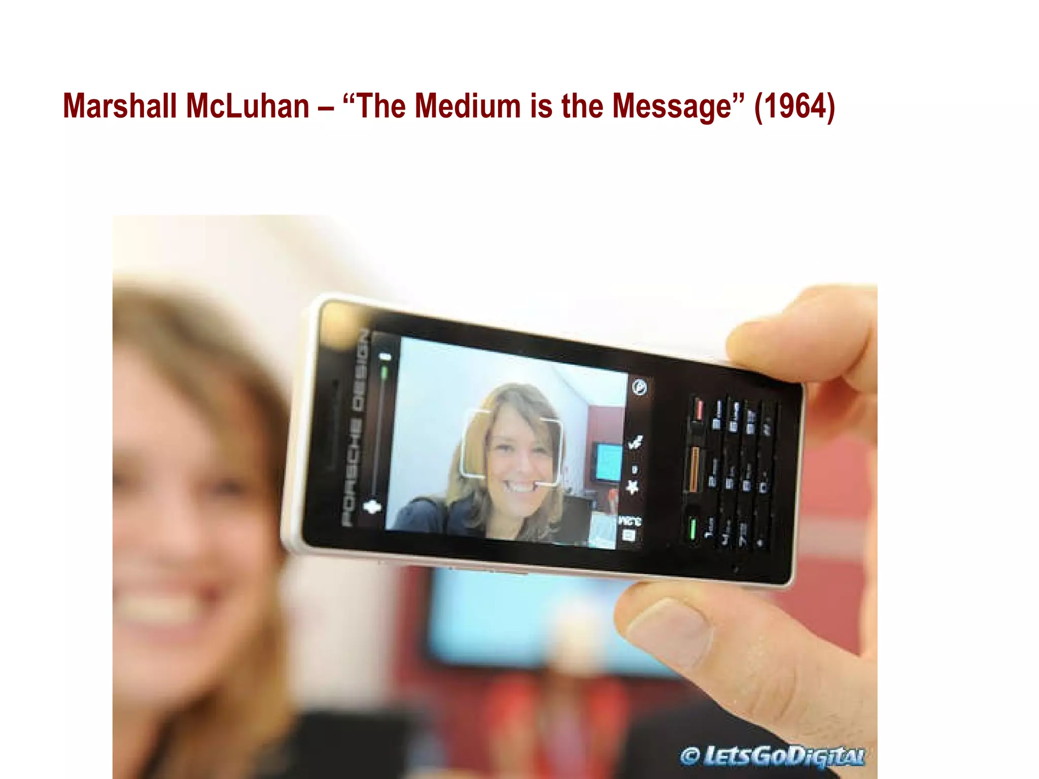 The document discusses Marshall McLuhan's theory that "the medium is the message" and how new technologies introduce changes to human affairs and society in terms of scale, pace, and pattern. It provides examples of how print culture and electronic media affected fragmentation, centralization, and perceptions of time and space. McLuhan believed new technologies have "unanticipated consequences" and change social and cultural forms in non-obvious ways that people often fail to recognize. The document also examines McLuhan's views on the differences between oral, literate, and electronic eras and cultures.