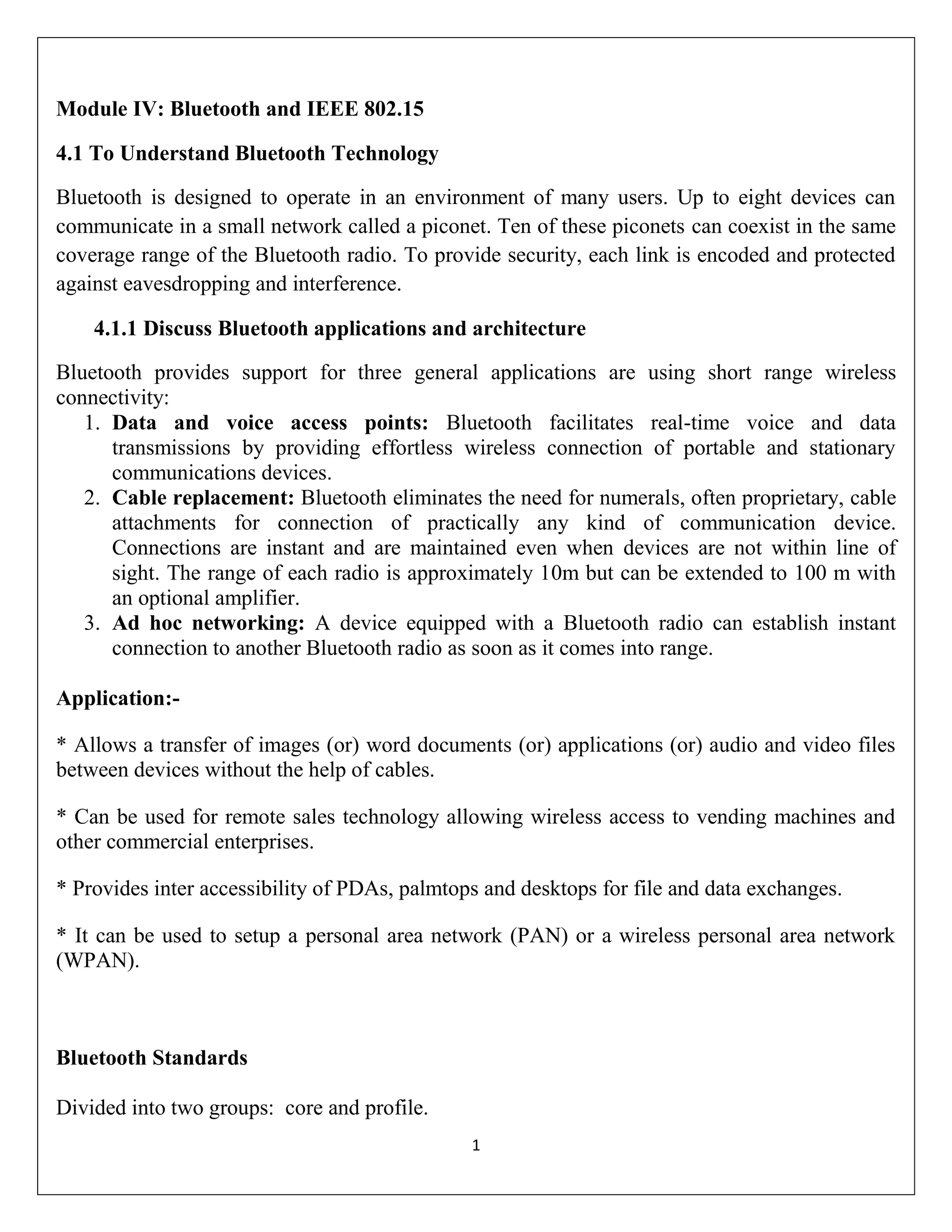 Bluetooth allows up to 8 devices to communicate in a piconet and 10 piconets can coexist. Each link is encoded for security.