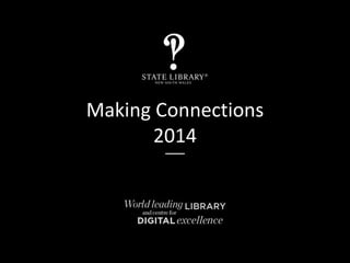 The document summarizes the State Library of NSW and its Public Library and Learning Services division. It discusses the State Library's components and services. It then describes Public Library and Learning Services, which oversees public libraries across NSW through funding, programs, and advisory services. Public libraries in NSW serve over 3 million members through hundreds of locations and mobile libraries. The State Library works to support public libraries and ensure compliance with the Library Act of 1939.