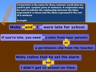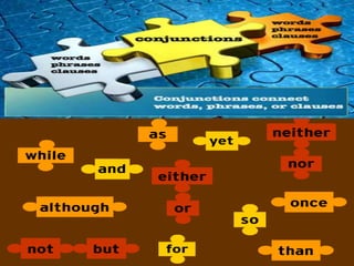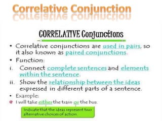 This document discusses different types of conjunctions and their uses. It provides examples of coordinating conjunctions, subordinating conjunctions, and correlative conjunctions. It also discusses the proper punctuation to use with different clauses, such as using commas and semicolons between independent clauses and dependent clauses introduced by subordinating conjunctions.