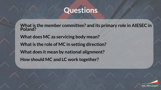 The member committee (MC) serves as the servicing body for AIESEC in Poland. As a servicing body, the MC provides assistance, consultation, direction, and support to local committees. It serves to align AIESEC in Poland with international strategies and represents the organization externally. The MC also manages operations, legal and finance functions, conferences, and local committee development to help unify and strengthen the organization in Poland. It works to provide services like these through capable and experienced teams. The goal of the MC's work is to empower local committees and advance AIESEC's mission on a national level in Poland.