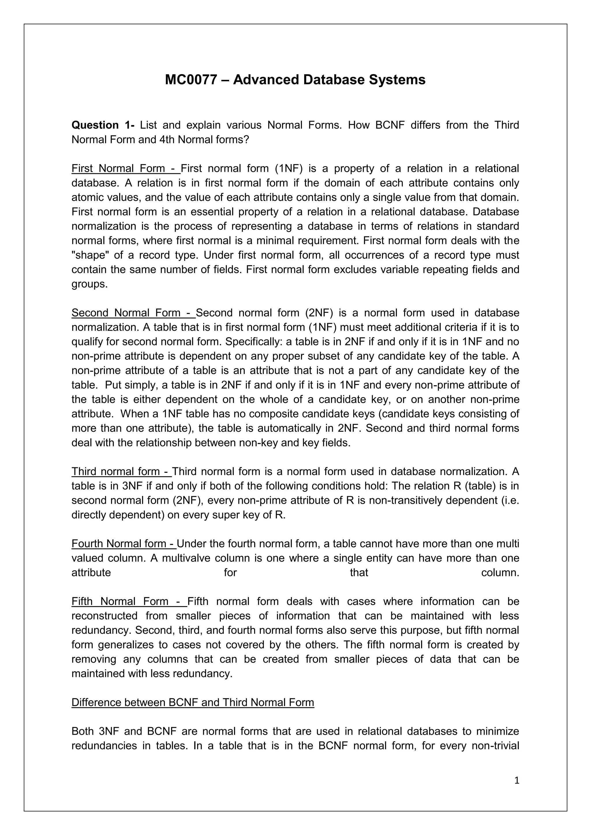The document provides information on various database normalization forms including 1NF, 2NF, 3NF, BCNF, and 4NF. It explains the differences between 3NF and BCNF, noting that BCNF is a stronger normal form that can capture some anomalies not captured by 3NF. It also discusses the differences between distributed and centralized database systems, highlighting advantages of data distribution such as data sharing, reliability/availability through replication, and faster query processing through parallelization.