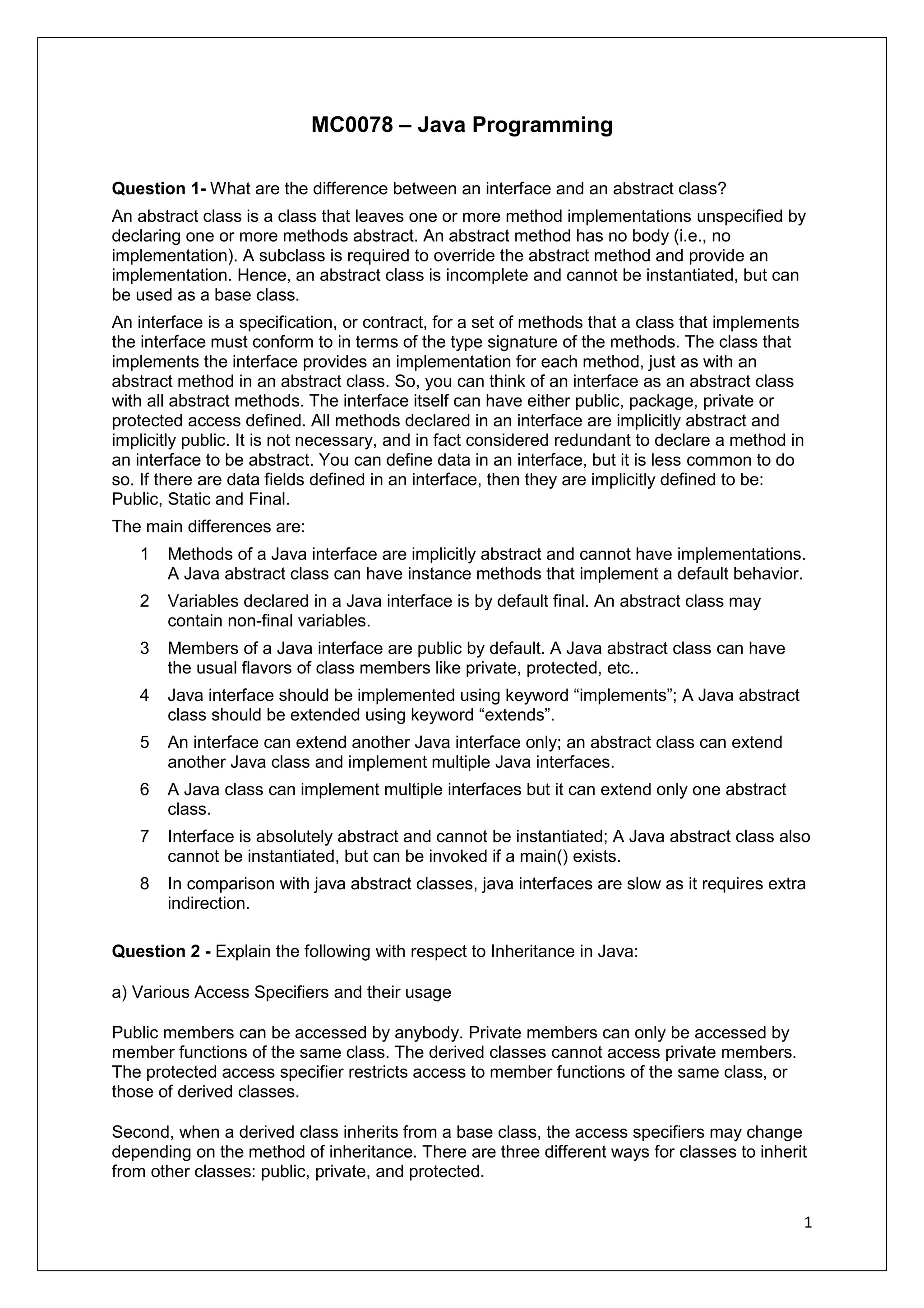 An interface is a specification for methods that a class must implement, while an abstract class can contain both implemented and non-implemented methods. The main differences are that interface methods are implicitly abstract, variables in interfaces are final by default, and interfaces can only extend other interfaces while abstract classes can extend classes and implement interfaces. Exception handling in Java uses try/catch blocks to handle exceptions, with checked exceptions requiring handling at compile time. Abstract classes are incomplete classes that cannot be instantiated directly but can serve as base classes, while object adapters use delegation to adapt existing classes to new interfaces. Sockets in Java allow reading/writing between client and server programs, with the server creating a ServerSocket to listen for client connections.