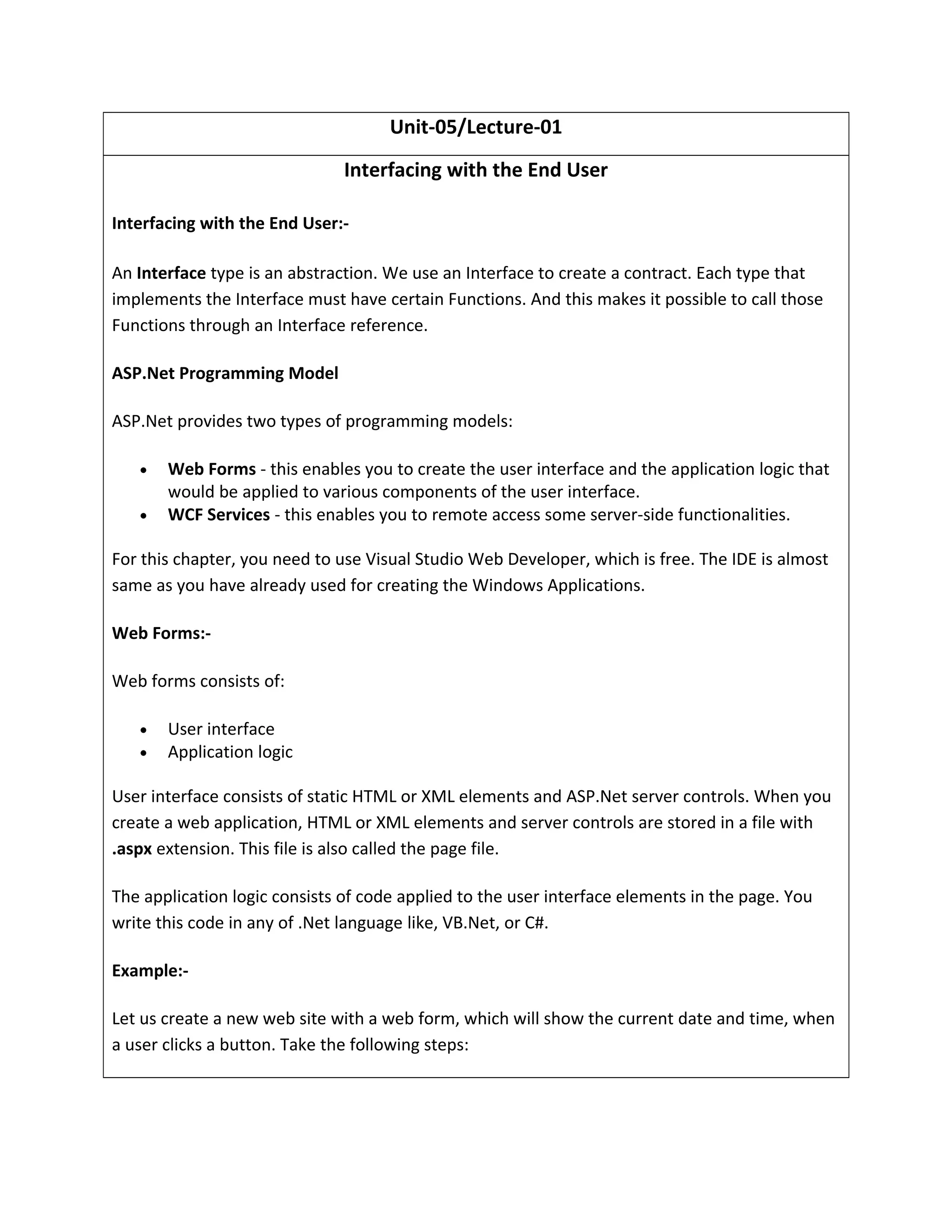 The document discusses interfacing with end users in ASP.NET. It provides two programming models - Web Forms and WCF Services. Web Forms enables creating user interfaces and application logic, while WCF Services enables remote server-side functionality access. It also discusses creating a basic web form in ASP.NET that displays the current date and time when a button is clicked to demonstrate the Web Forms model. Common controls like labels, textboxes, buttons are also summarized with their properties and events.